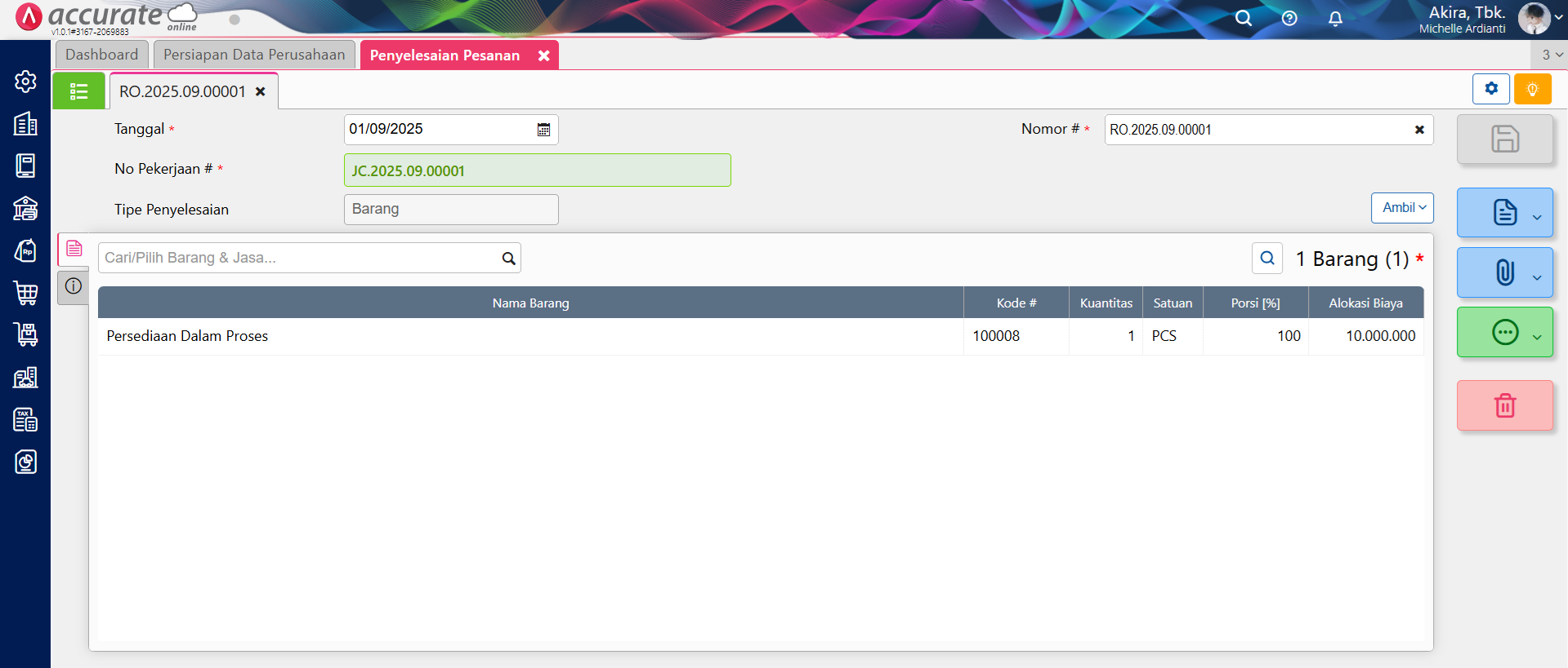 3. Selanjutnya, membuat Penyelesaian Pesanan atas pekerjaan pesanan tersebut melalui menu Persediaan, pilih nomor transaksi pekerjaan pesanan yang dibuat pada poin 2, kemudian pilih Tipe Penyelesaian-nya adalah Barang lalu pilih Barang persediaan setengah jadi tersebut, kemudian Simpan transaksi.