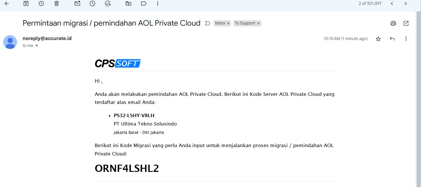 4. Cek inbox email dengan search norelpy@accurate.id sehingga mendapatkan kode server dan kode pemindahan seperti di bawah ini: