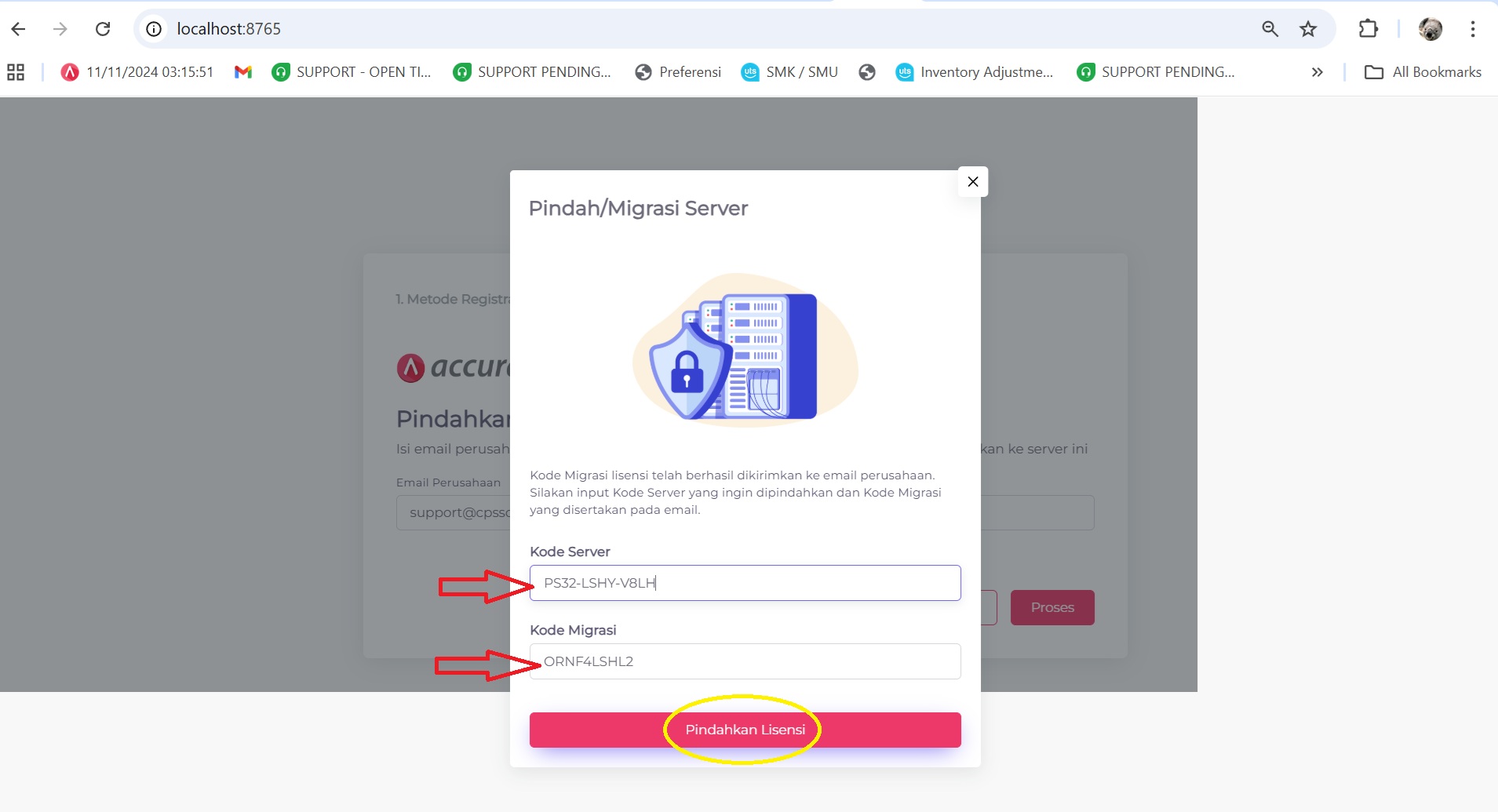 5. Selanjutnya, akses kembali web browser sebelumnya dan input kode server dan kode migrasi kemudian klik pindahkan lisensi :