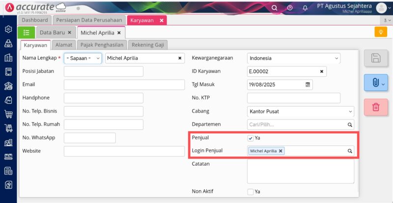 - Pengguna Level Operator tersebut merupakan pengguna dengan Login Penjual. Informasi ini bisa anda lakukan pengecekan melalui modul Karyawan yang terdapat di menu Perusahaan.