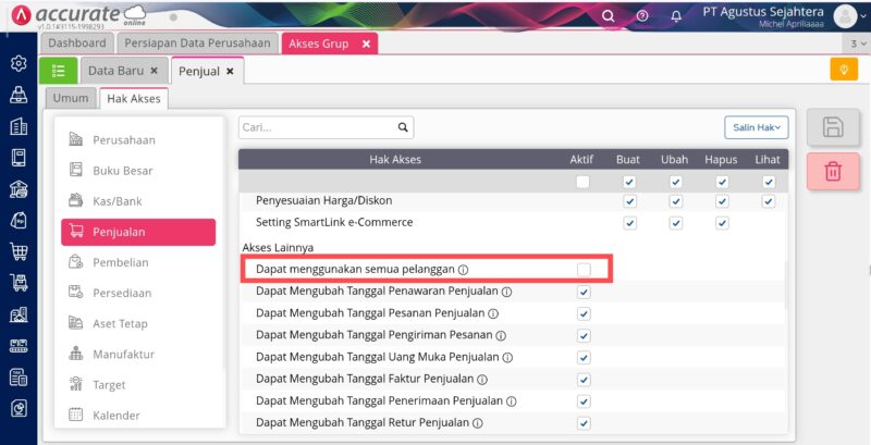 - Pengguna Level operator tersebut tidak diberikan Akses ‘Dapat Menggunakan Semua Pelanggan’ pada Akses Grup-nya, dan