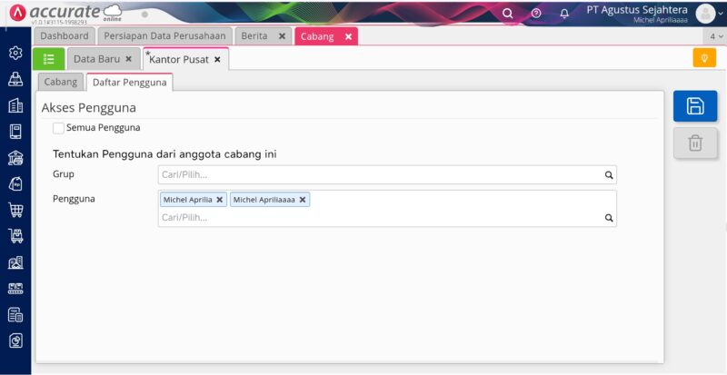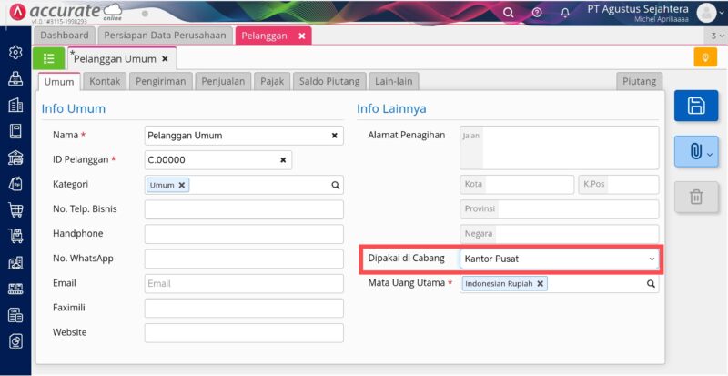 - Pelanggan yang bersangkutan (yang tidak tampil) digunakan pada semua cabang atau memilih nama cabang yang sama dengan Pengguna Level Operator tersebut (jika anda menggunakan fitur Cabang). Informasi ini bisa dilakukan pengecekan dari modul Penjualan | Pelanggan, pilih nama pelanggan tersebut dan cek di tab Umum pada bagian ‘Dipakai di Cabang’. Dan untuk pengguna nya bisa dilakukan pengecekan ke menu Perusahaan | Cabang pada tab Pengguna.