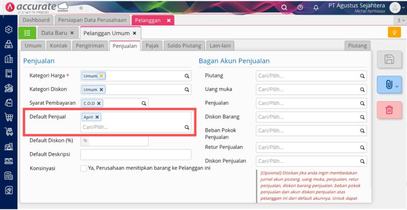 - Informasi Default Penjual pada Pelanggan yang tidak bisa dipilih dalam transaksi penjualan oleh Pengguna Level Operator tersebut, diisi dengan nama Penjual lain (bukan nama Pengguna Level Operator yang dimaksud). Anda bisa melakukan pengecekan melalui Daftar Pelanggan di menu Penjualan.