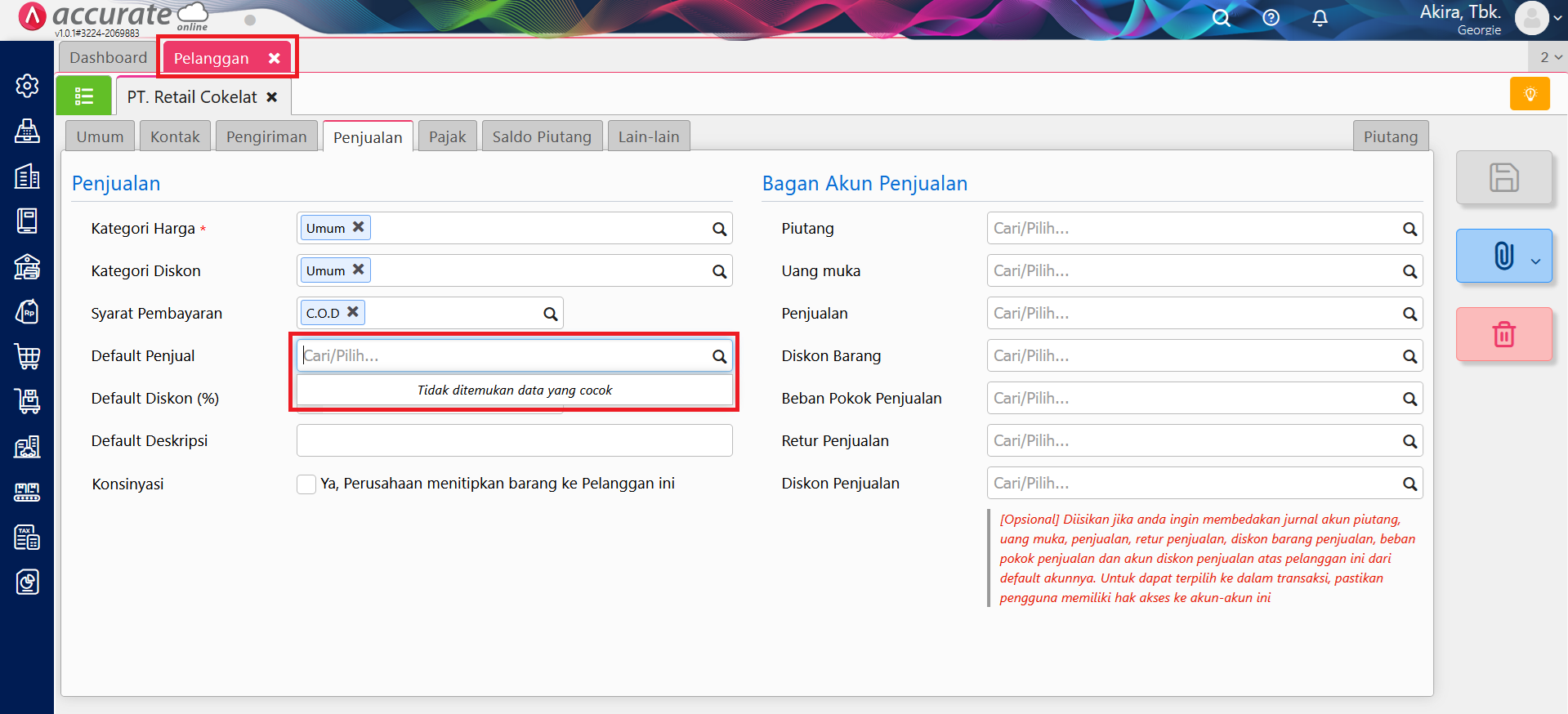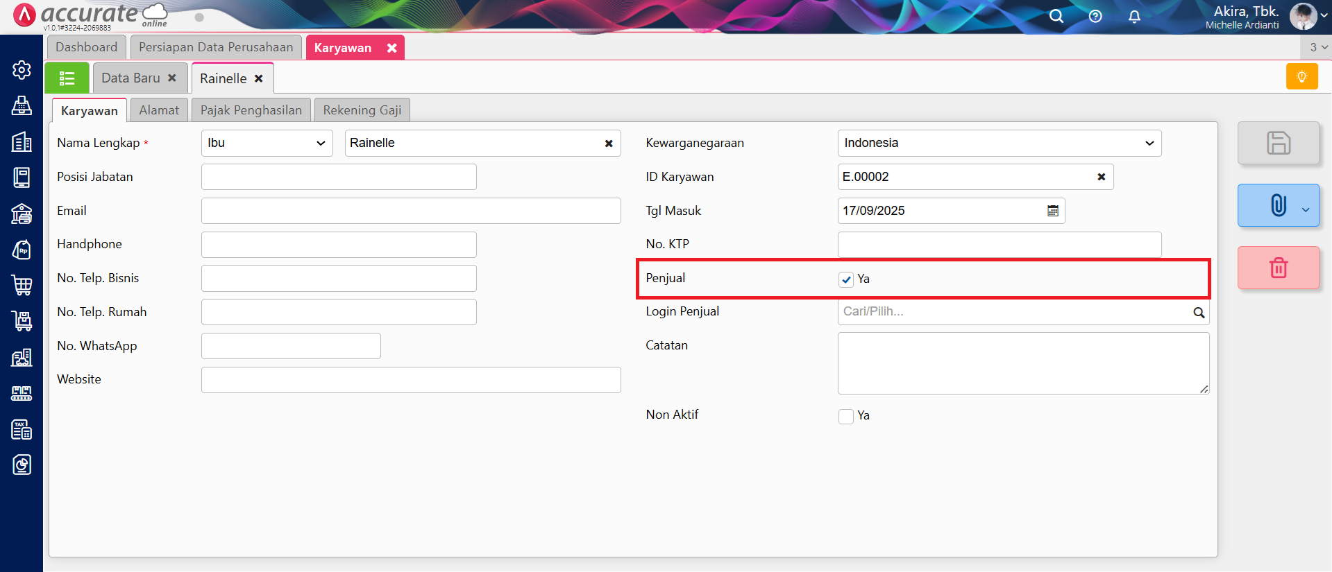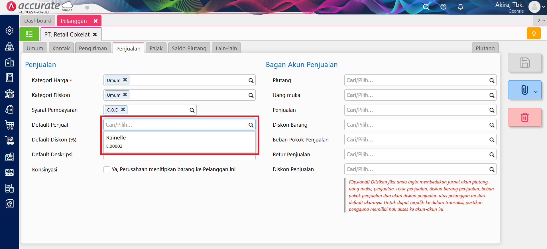 - Setelah-nya, Pengguna Operator yang dimaksud, silakan untuk login ke accurate.id dan akses Database yang dimaksud, seharusnya sudah bisa memilih Nama Penjual sebagai Default Penjual di Pelanggan dan nama penjual tersebut akan tampil pada Daftar Karyawan.