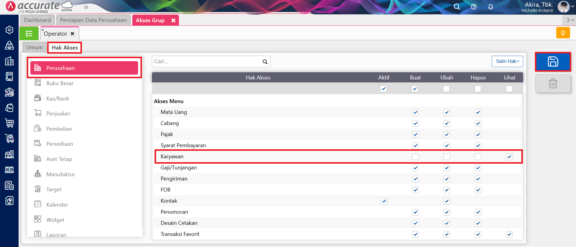 - Kemudian ke tab Hak Akses | Perusahaan, dan centang informasi Karyawan, lalu klik Simpan.