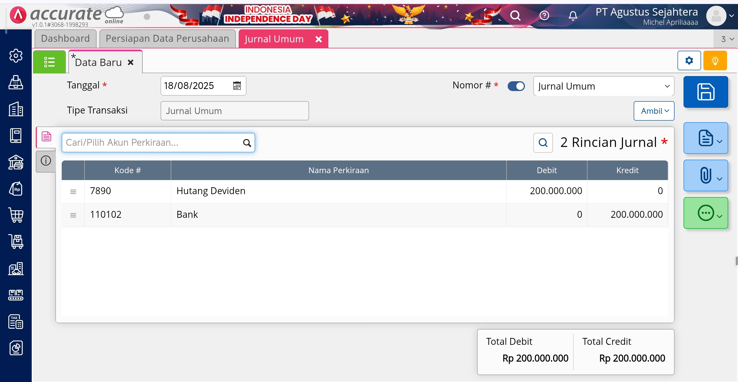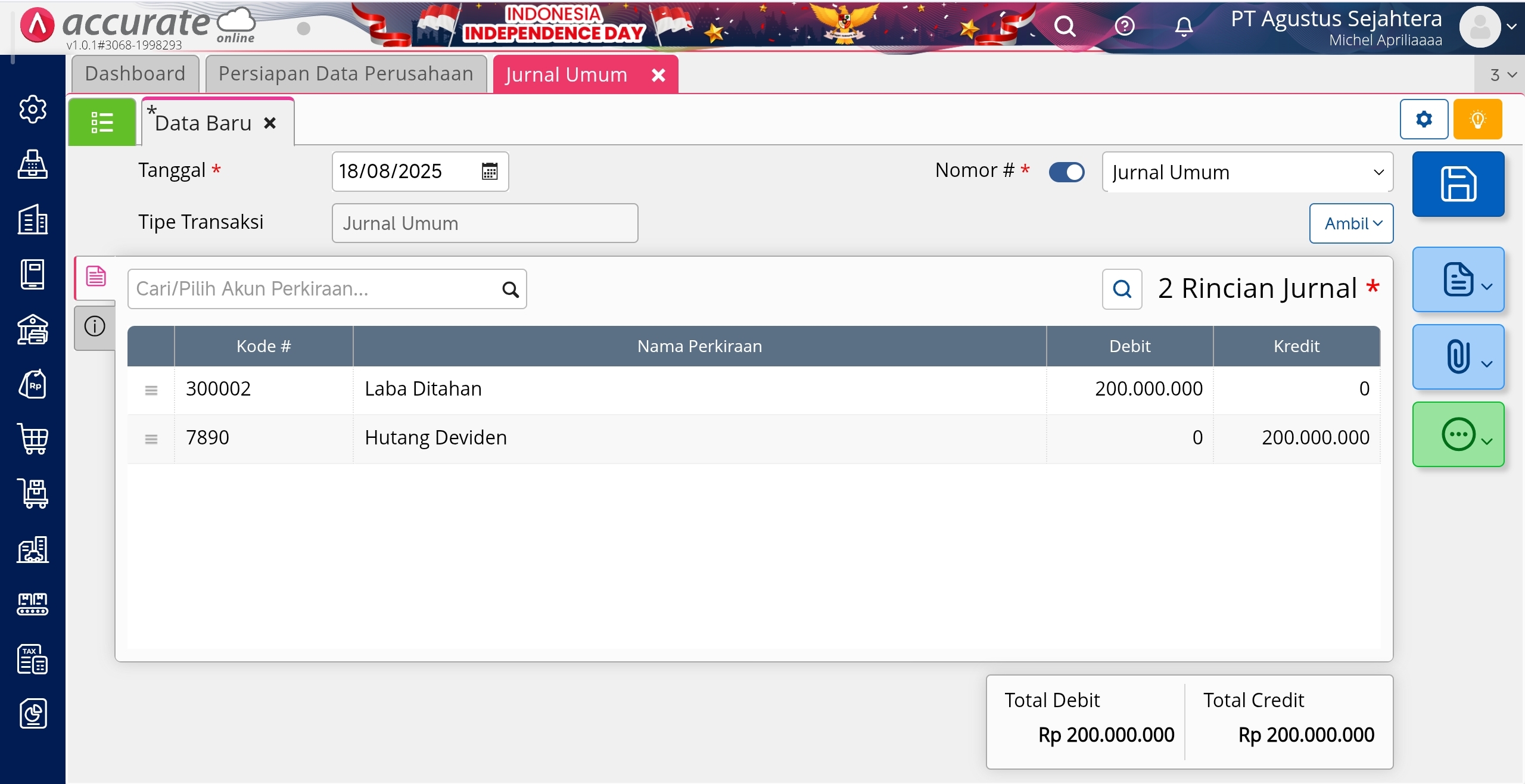 Berikut ini langkah-langkah untuk melakukan pencatatan atas pembagian Deviden di Accurate Online :