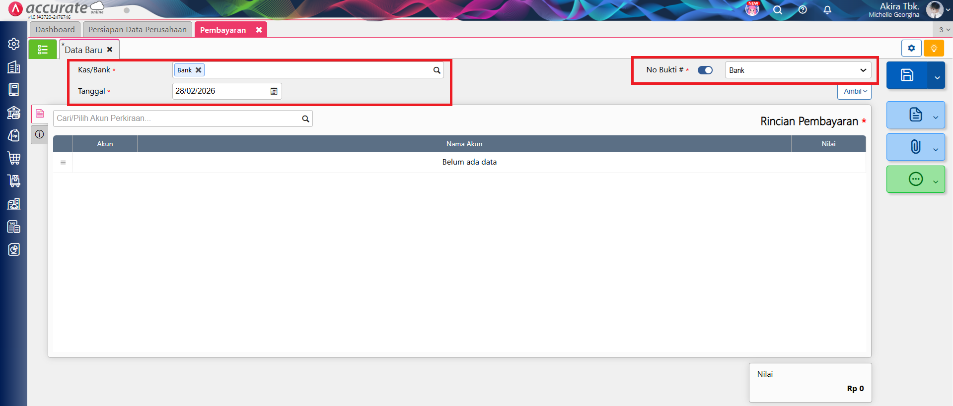 - Masuk ke menu Kas & Bank | Pembayaran | Data Baru, dan isikan beberapa informasi seperti Kas/Bank, Tanggal, dan No Bukti #.