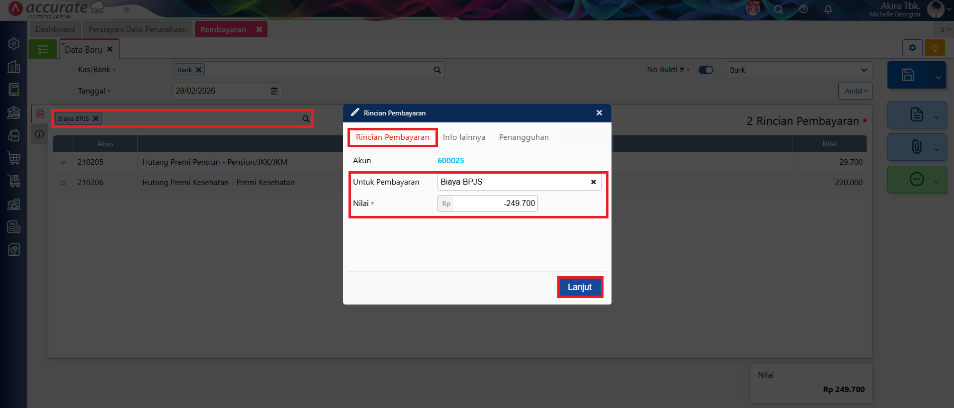 - Pada bagian Cari/Pilih, pilih nama karyawan dan lakukan penginputan atas rincian gaji karyawan tersebut, beserta dengan nilai Biaya BPJS yang sudah dilakukan pencatatan di awal, lalu klik Lanjut dan Simpan.