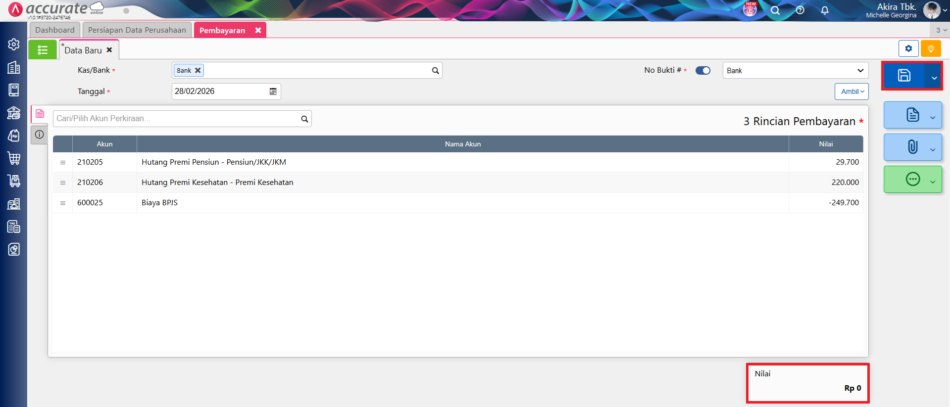 - Terakhir, pada bagian Cari/Pilih Akun Perkiraan, pilih akun Biaya BPJS dan nilai yang sudah dilakukan pembayaran pada tahap I di poin 2 dengan nilai minus, sehingga pada transaksi Pembayaran ini tidak ada nilai Kas/Bank yang berkurang, dikarenakan sudah dilakukan pembayaran atas biaya BPJS tersebut diawal, lalu klik Simpan.