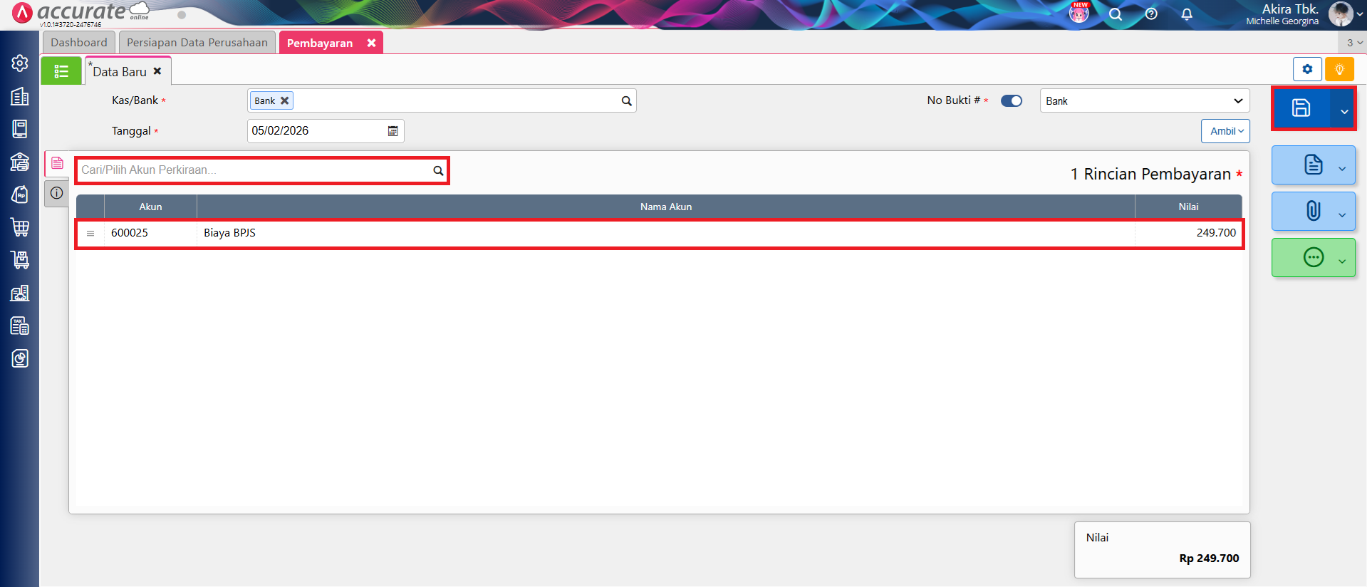 - Selanjutnya pada bagian Cari/Pilih Akun Perkiraan, masukan akun dan inputkan nilai yang dilakukan pembayaran atas Biaya BPJS tersebut, lalu klik Simpan.