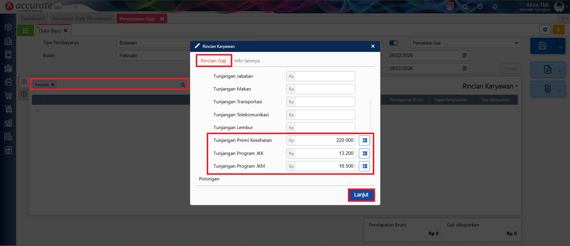 Ilustrasi: Pada bulan Februari 2026, untuk karyawan yang bernama Rainelle memiliki rincian Gaji sebagai berikut, dan perusahaan ingin melakukan pencatatan atas pembayaran biaya BPJS atas karyawan tersebut di awal bulan.