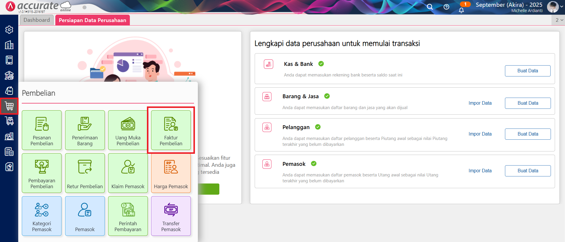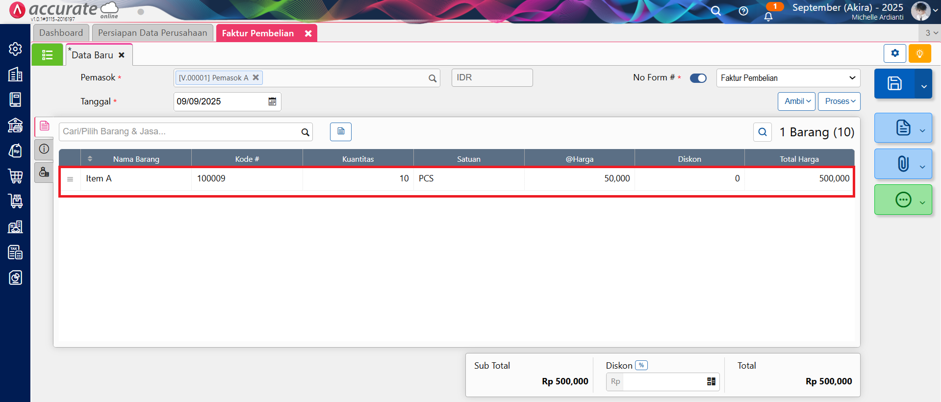 - Membuat Faktur Pembelian dari modul Pembelian, kemudian pilih nama pemasok yang bersangkutan dan lengkapi informasi pada Faktur Pembelian sesuai kebutuhan.