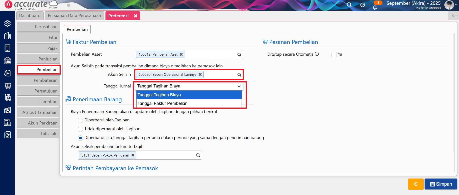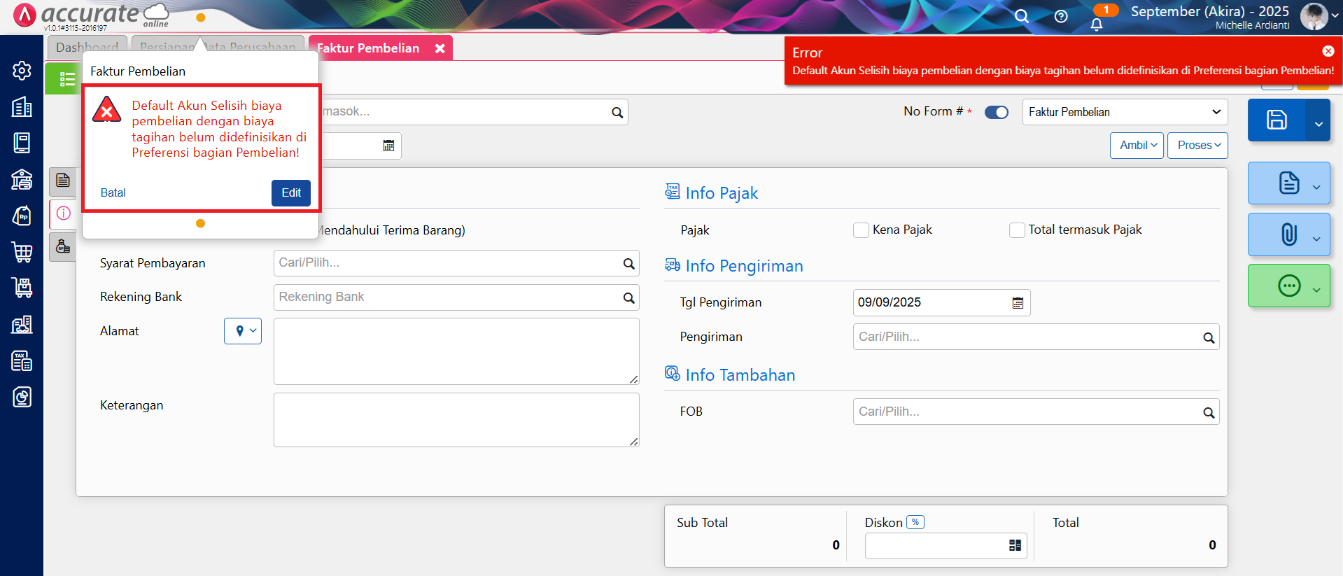 - Saat Anda menyimpan transaksi Faktur Pembelian atas biaya dan tampil pesan error seperti gambar terlampir. Klik pilihan Edit kemudian lakukan pengaturan dari menu Pengaturan | Preferensi | Pembelian, lalu isikan akun untuk menampung nilai selisih pada transaksi pembelian barang dengan tambahan biaya ke pemasok lainnya, serta atur penentuan waktu untuk menjurnal nilai selisih tersebut. Apakah nilai selisih akan dijurnal pada tanggal Faktur Pembelian Barang atau pada saat Faktur Tagihan Biaya-nya. Nilai selisih ini terjadi, jika Anda belum mengetahui (menerima tagihan dari pemasok) nilai biaya – biaya atas pembelian barang, namun perlu melakukan pengakuan nilai biaya tersebut pada saat barang diterima, sehingga Anda perlu membuat asumsi atas nilai dari biaya – biaya tersebut. Selisih bisa terjadi antara nilai yang diasumsikan dengan nilai aktual yang ditagihkan ke Anda.
