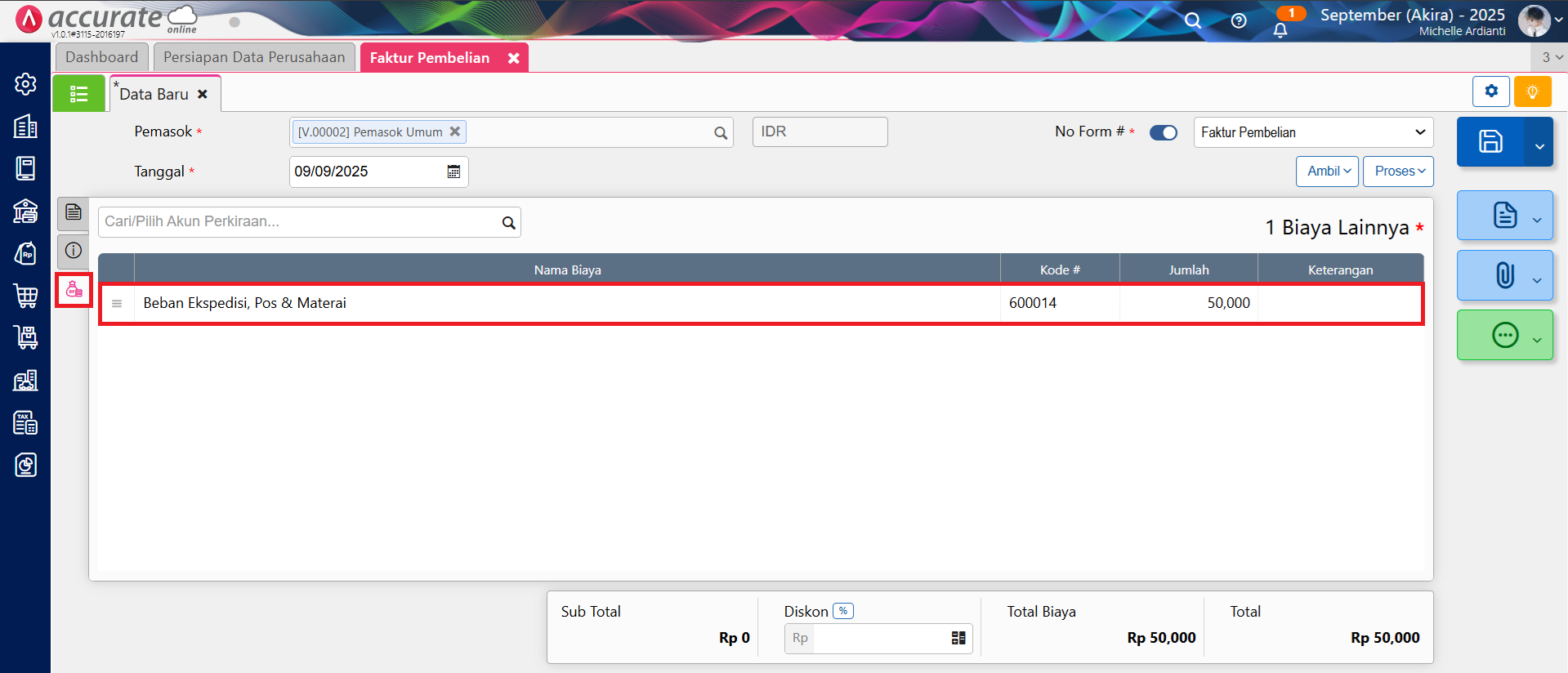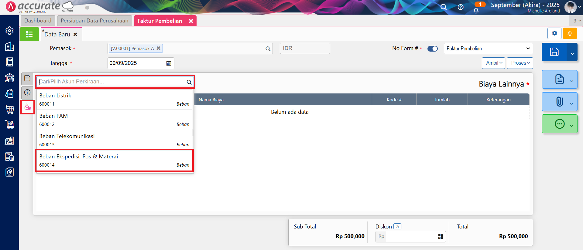 - Klik icon RP untuk mencatat biaya – biaya yang dikeluarkan atas pembelian tersebut dan pilih akun biaya yang sesuai, maka akan tampil kotak ‘Biaya Lainnya’.