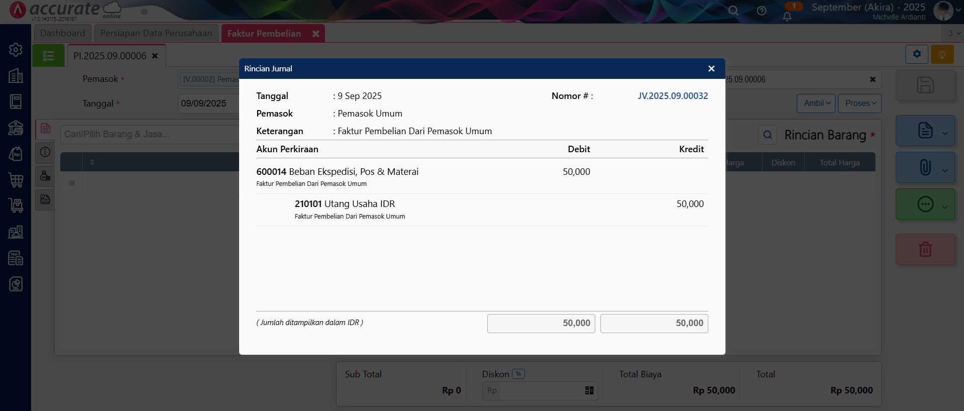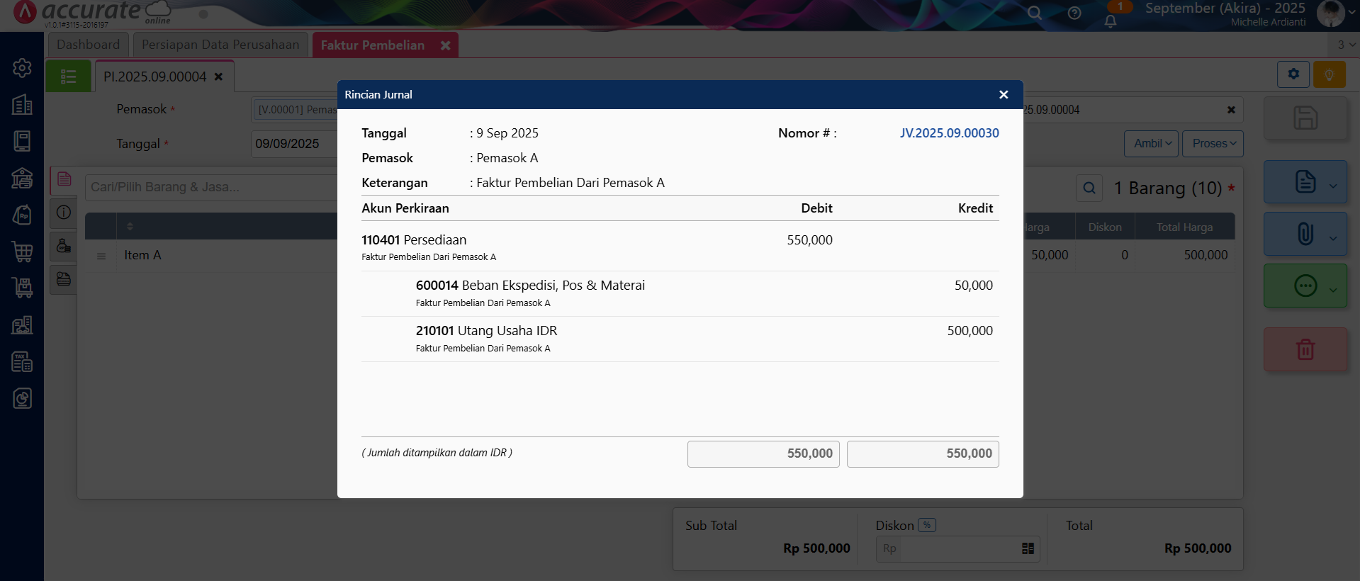 - Anda bisa membebankan biaya atas pembelian barang lebih dari 1 (satu) dengan masing-masing pemasok yang berbeda juga. Berikut tampilan dari Faktur Pembelian dengan tambahan biaya yang dibebankan ke harga pokok barang serta jurnal yang terbentuk.