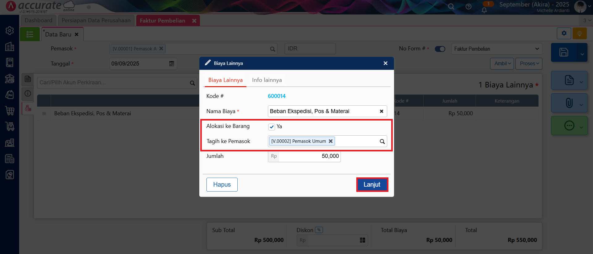 - Centang ‘Ya’ pada informasi Alokasi Ke Barang dan pilih nama pemasok pada Tagih ke Pemasok, untuk pembayaran atas biaya – biaya tersebut, jika biaya tersebut dibayarkan ke pemasok yang berbeda dengan pembelian barang tersebut. Dan isikan nilai biaya yang dikeluarkan pada kolom Jumlah, kemudian klik Lanjut untuk menyimpannya.