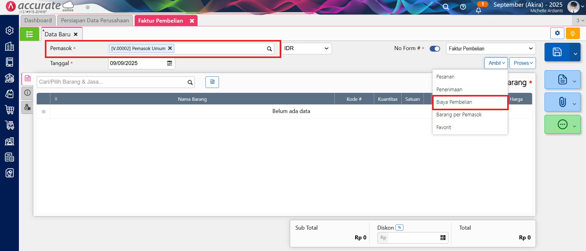 Berikut langkah – langkah yang perlu untuk dilakukan dalam mencatat tagihan biaya tambahan atas pembelian barang, yang ditagihkan dari pemasok yang berbeda dengan pemasok pembelian barang :