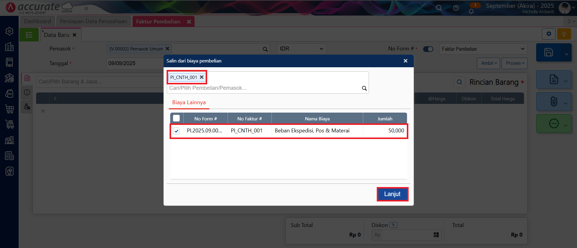 Memilih Nomor Faktur Pembelian Barang dengan Biaya Tambahan