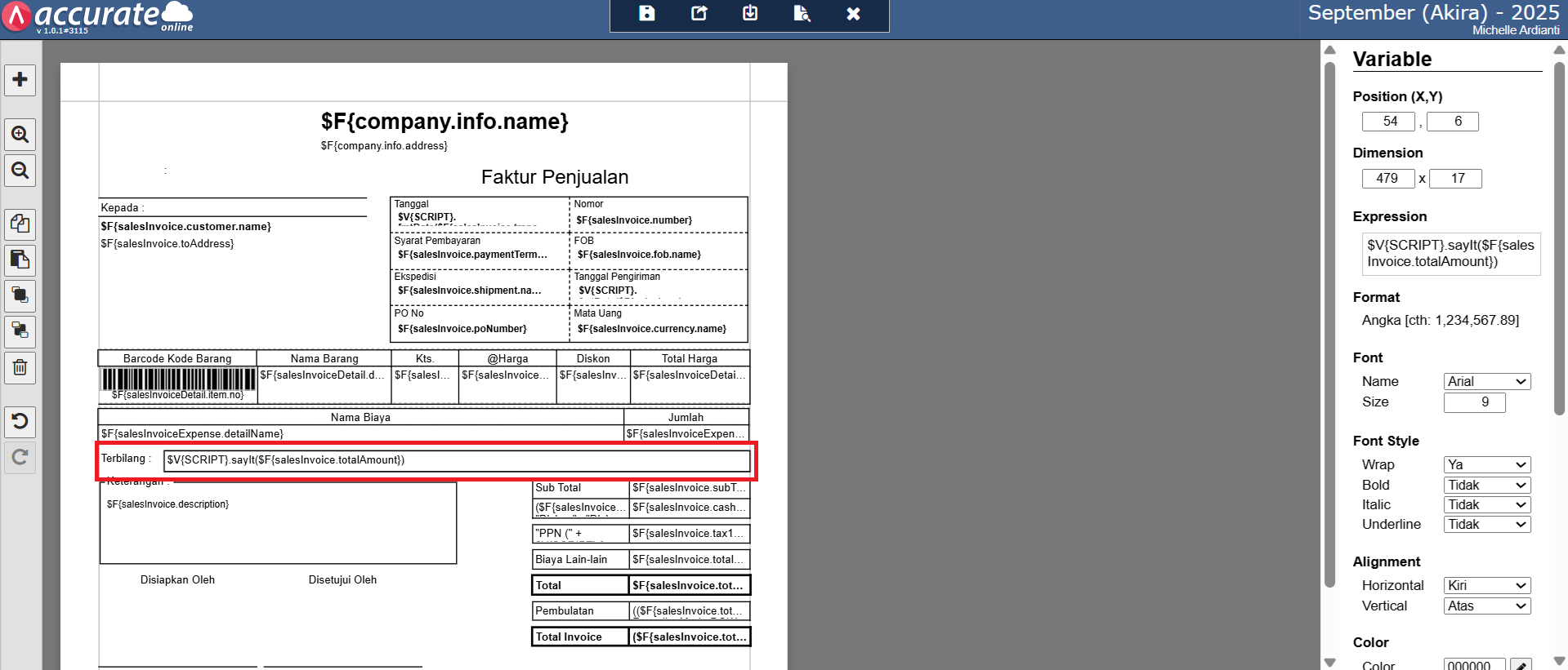 - Lakukan perubahan skrip rumus pada kolom variable ‘Terbilang‘, supaya informasinya sesuai dengan nilai yang tampil pada variable Total Invoice, yaitu $V{SCRIPT}.sayIt(($F{salesInvoice.totalAmount}/(1000)).setScale(0, RoundingMode.DOWN)*(1000) == $F{salesInvoice.totalAmount} ? $F{salesInvoice.totalAmount} :(($F{salesInvoice.totalAmount}/(1000))+(1)).setScale(0, RoundingMode.DOWN)*(1000))