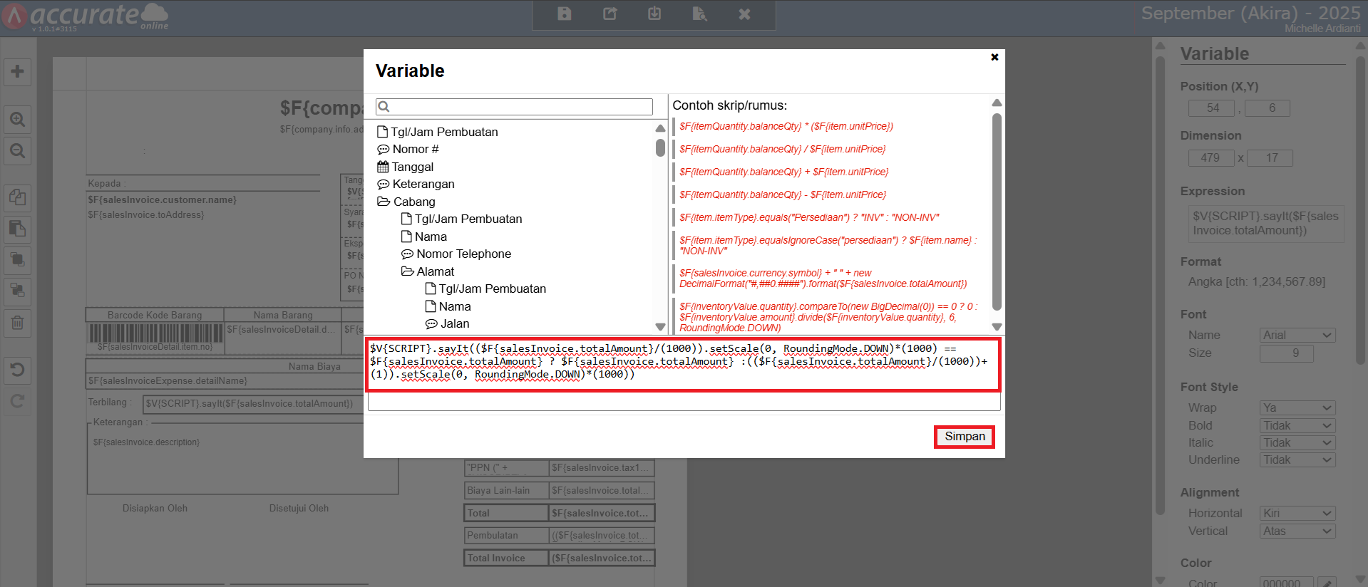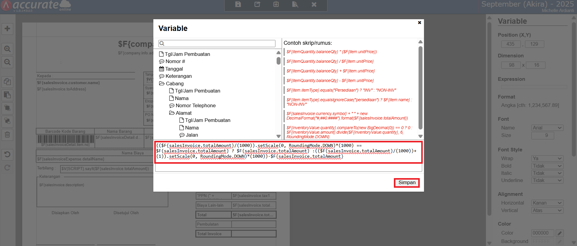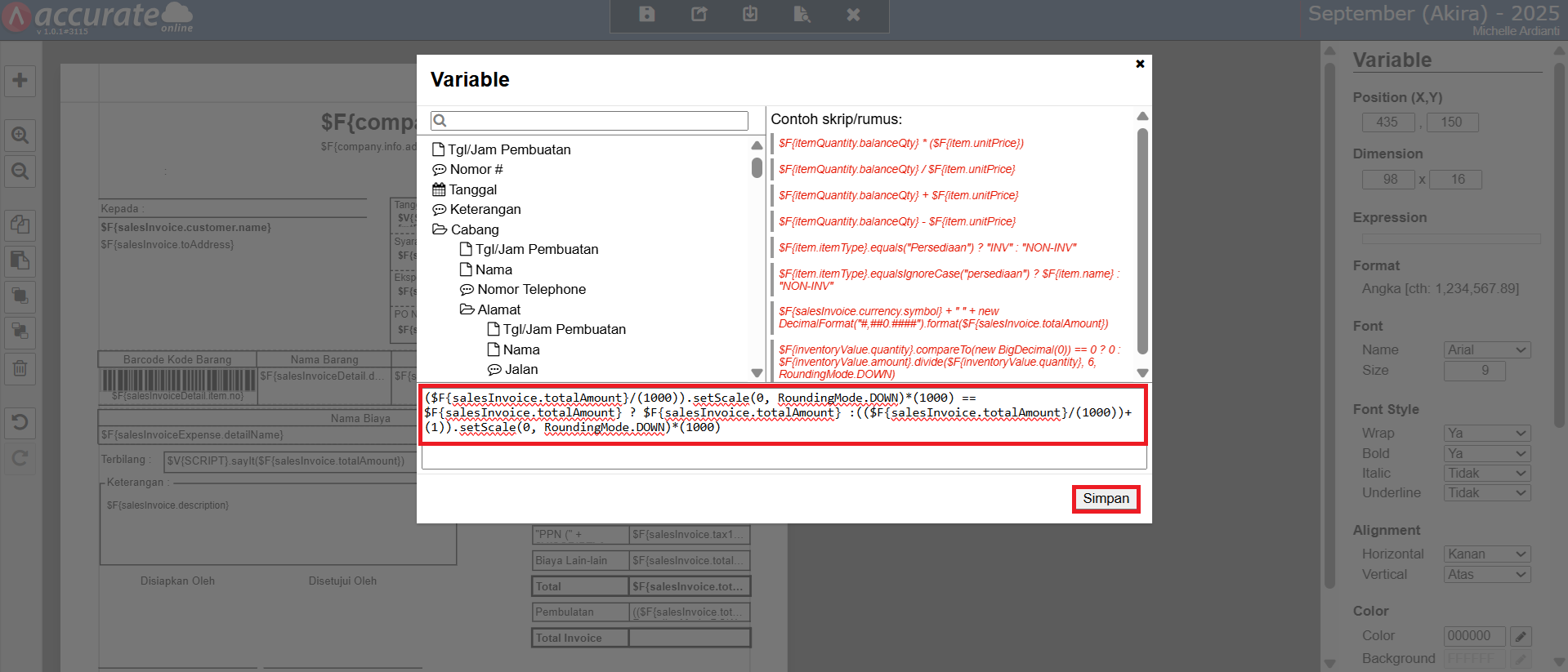 - Klik dua kali kolom variable yang sudah ditambahkan sebelumnya, dan inputkan skrip rumus berikut ini pada kolom Pembulatan dan Total Invoice.