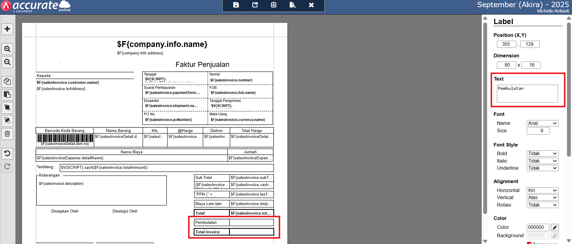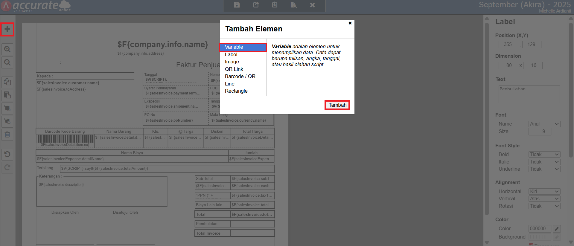 - Selanjutnya, tambahkan 2 Label dengan cara klik tombol Tambah Element (icon +) | Label, klik Tambah dan posisikan kolom Label tersebut sesuai dengan yang diinginkan, dan berikan nama (misal, Pembulatan dan Total Invoice).
