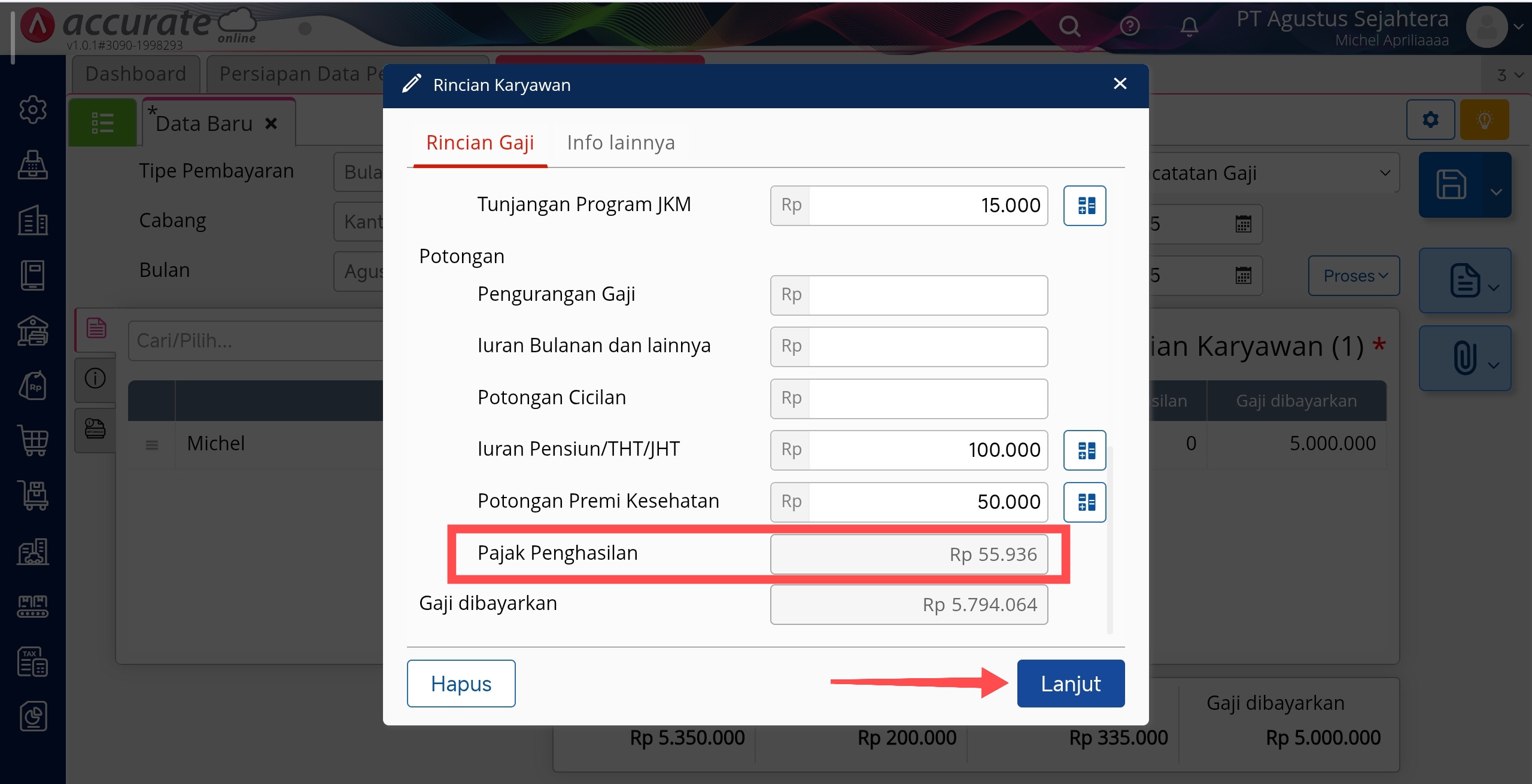 - Jika sudah melakukan penginputan rincian gaji, maka otomatis terhitung untuk Pajak Penghasilan (PPh 21) nya. Rincian perhitungan PPh 21 untuk karyawan tetap bisa klik disini. Kemudian klik Lanjut dan Simpan pencatatan gaji.