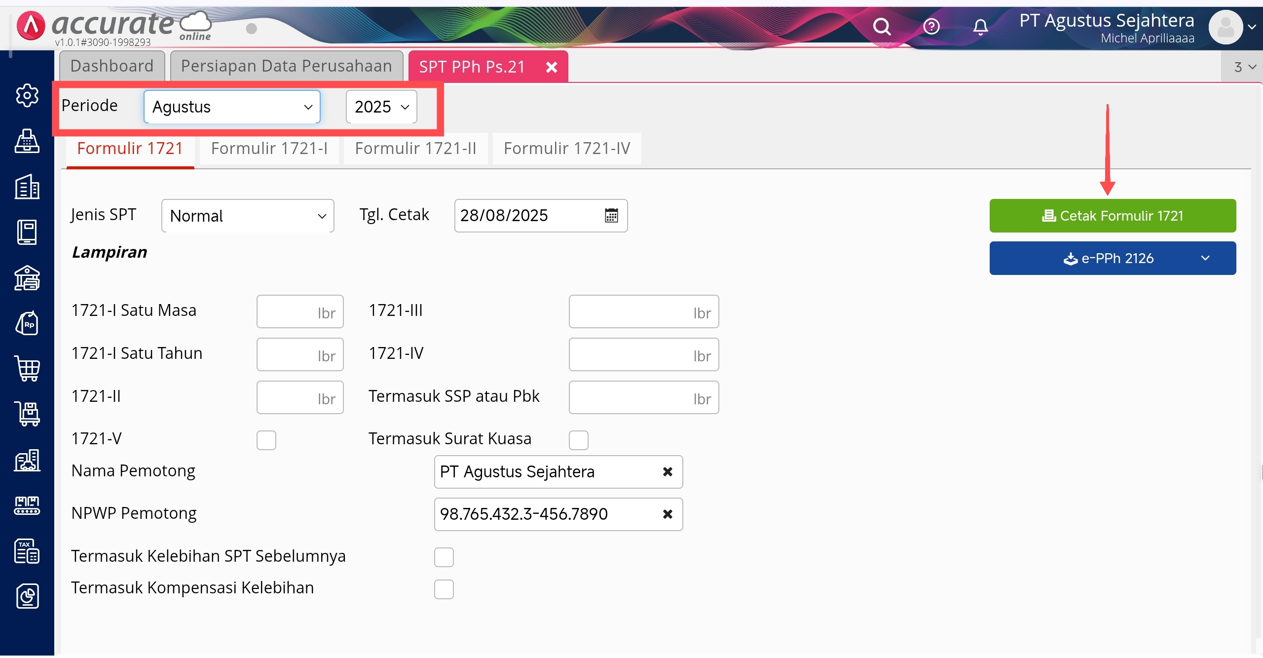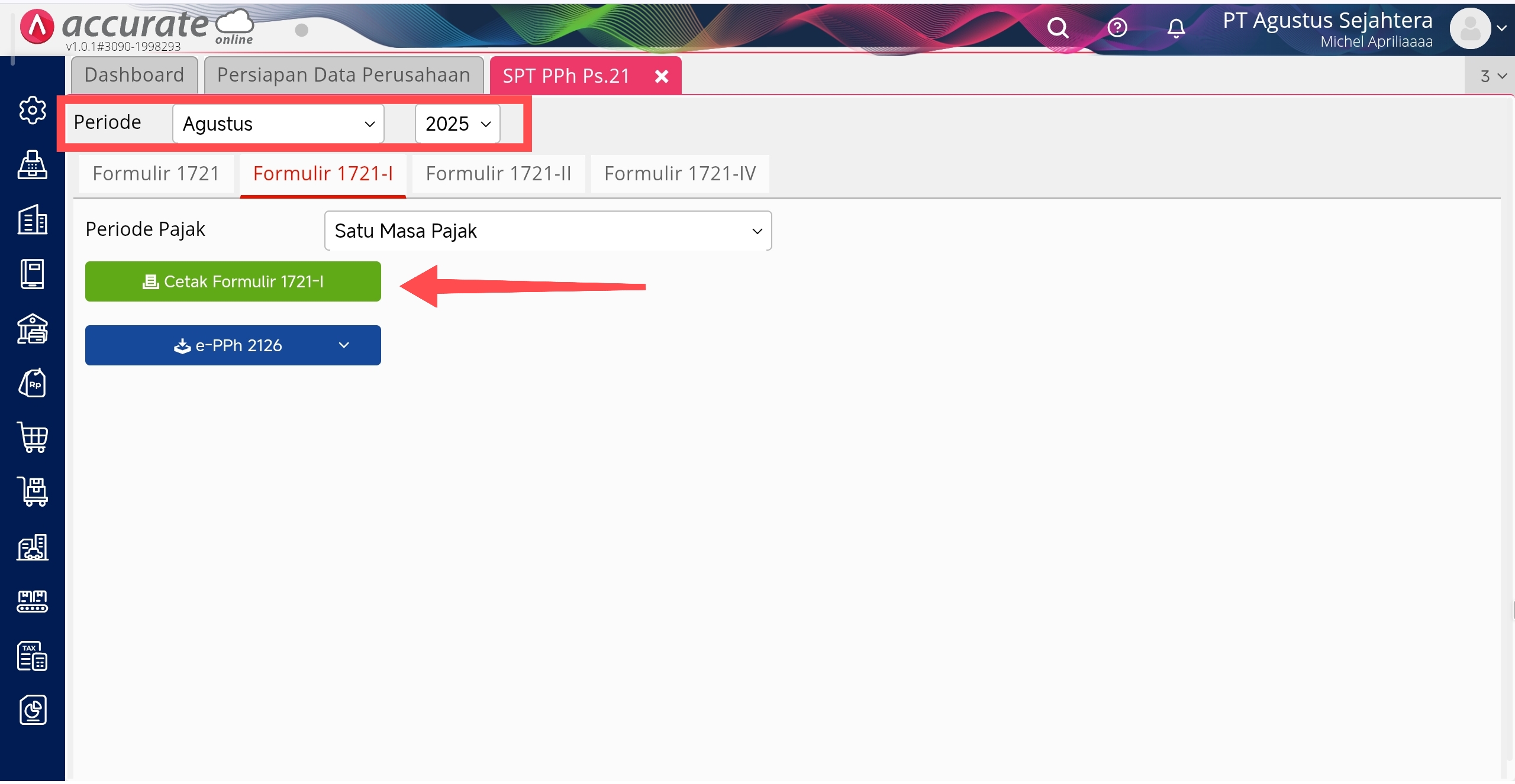 - Selanjutnya jika sudah membuat Pencatatan Gaji atas karyawan yang dikenai PPh 21, maka otomatis nilai PPh 21 tersebut tercatat pada Laporan SPT PPh 21 yang terdapat di Accurate Online. Anda bisa melihatnya dari menu menu Laporan | SPT PPh 21, kemudian tentukan periode bulan dan tahun yang sama dengan pencatatan gaji, kemudian pilih formulir yang diinginkan lalu klik Cetak Formulir.