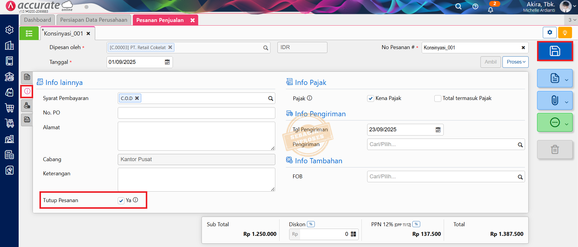 6. Dikarenakan Pesanan Penjualan sebelumnya masih berstatus ‘Sebagian diproses’, maka bisa dilakukan tutup manual dengan cara buka transaksi Pesanan Penjualan tersebut lalu ke tab i (Info Lainnya), kemudian centang informasi ‘Ya’, lalu klik Simpan.