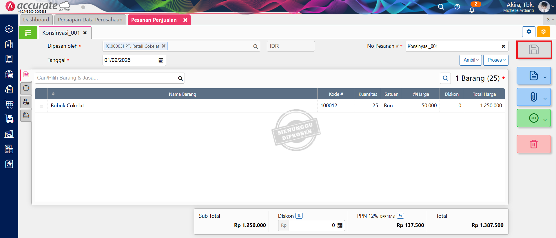 2. Buat Pesanan Penjualan atas barang yang dititipkan kepada PT. Retail Cokelat dari menu Penjualan | Pesanan Penjualan | Data Baru, dan isikan sesuai dengan contoh kasus, lalu klik Simpan.