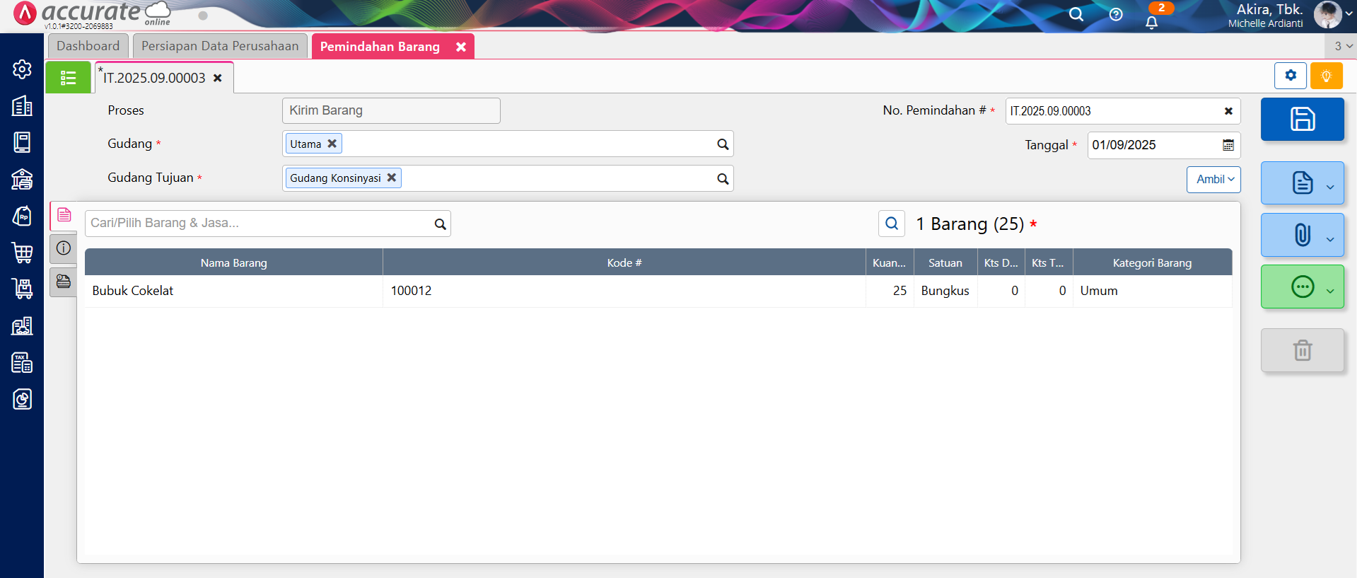 3. Selanjutnya, lakukan pemindahan barang dari Gudang Utama ke Gudang Konsinyasi dari menu Persediaan | Pemindahan Barang, yaitu mulai dari Kirim Barang ke Gudang Konsinyasi dan Terima Barang.