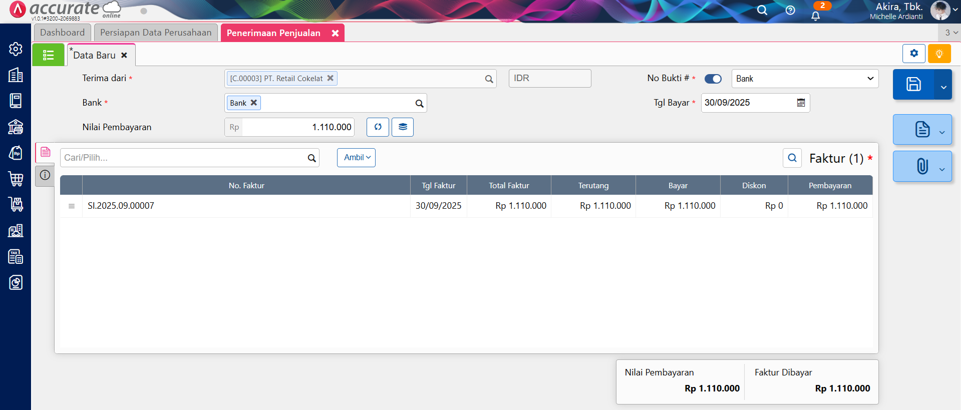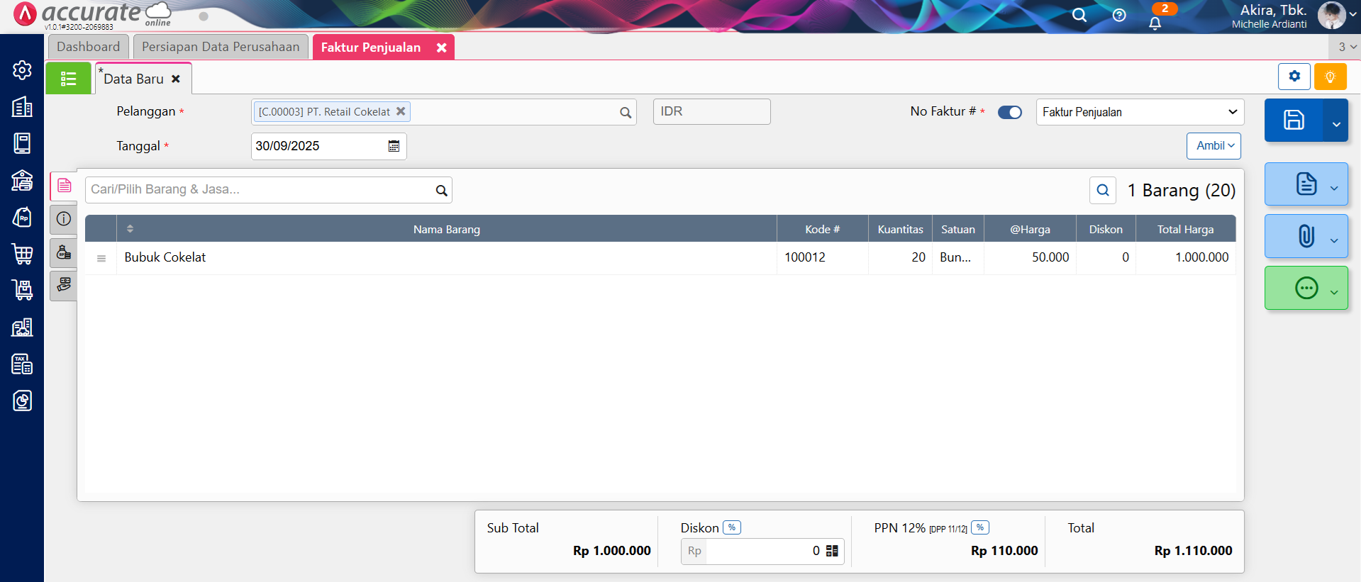 4. Pada saat terima uang barang terjual dan barang yang dikembalikan pada tanggal 30/09/2025, buat Faktur Penjualan atas barang yang berhasil terjual melalui menu Penjualan | Faktur Penjualan. Lalu, klik ‘Ambil’ dan pilih nomor pesanan penjualan atas titipan barang tersebut (poin 2) dan isikan sejumlah barang yang berhasil terjual yaitu 20 Bungkus serta pilih Gudang Konsinyasi. Kemudian, dilanjutkan dengan melakukan proses Penerimaan Penjualan.