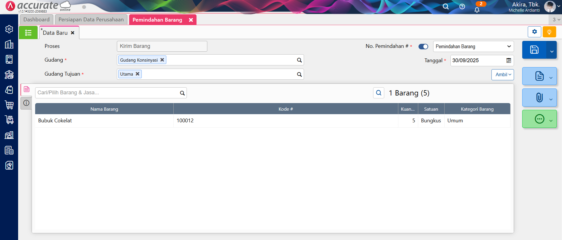 5. Dan untuk barang yang dikembalikan ke perusahaan, lakukan Pemindahan Barang kembali yaitu dengan proses Kirim dari Gudang Konsinyasi ke Gudang Utama sejumlah kuantitas yang dikembalikan, dan lakukan Terima Barang atas proses pemindahan barang tersebut. Sehingga stok barang di Gudang Utama bertambah sebanyak 5 Bungkus dan stok Gudang Konsinyasi berkurang sebanyak 5 Bungkus (sesuai jumlah kuantitas barang yang dikembalikan).