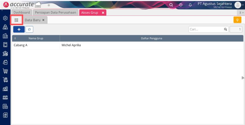 - Buka daftar Akses Grup dengan klik tombol daftar di samping tab Data Baru lalu pilih hak akses yang didalamnya ada pengguna yang dimaksud.