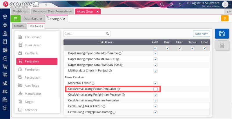 - Klik tab Hak Akses | Penjualan lalu cari dan jangan centang (aktifkan) informasi “Cetak/email ulang Faktur Penjualan” kemudian simpan.