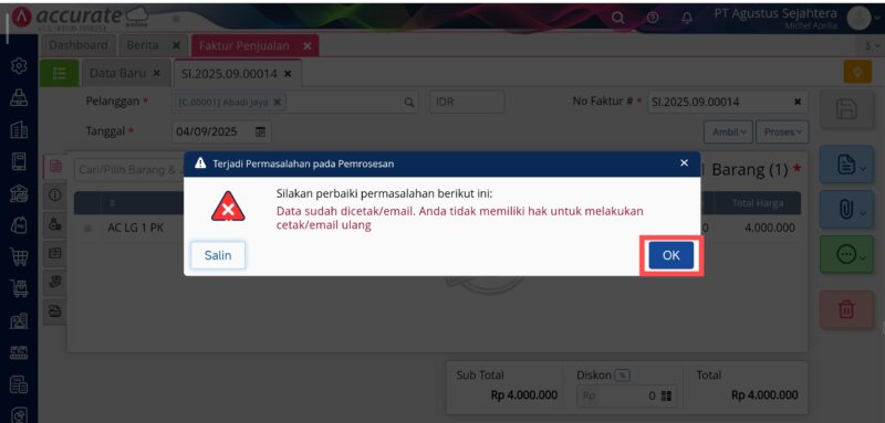 - Selanjutnya jika dicoba untuk melakukan Cetak/Email ulang atas transaksi Faktur Penjualan akan tampil pesan eror dan pada tab Info Lainnya di formulir transaksi Faktur Penjualan tersebut tampil informasi nama pengguna yang telah melakukan cetak/email transaksi faktur penjualan tersebut (perhatikan gambar).