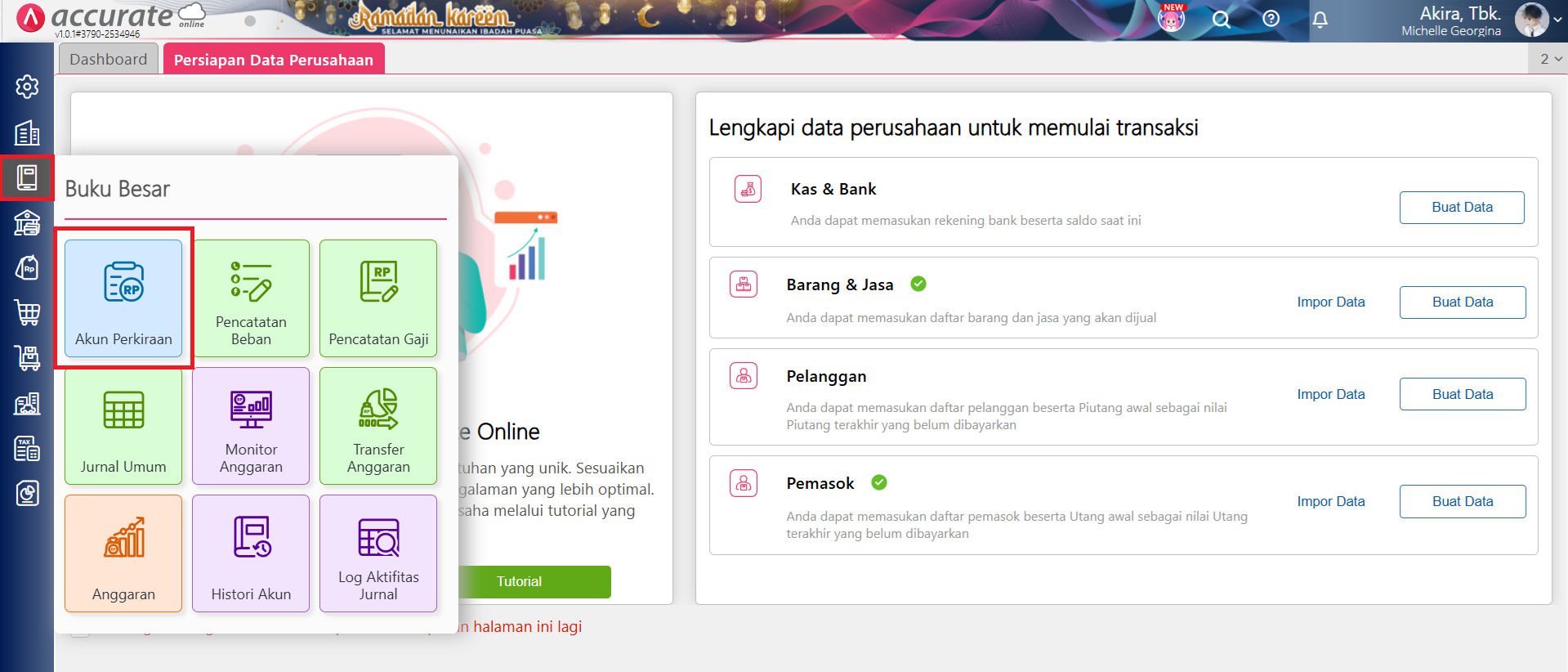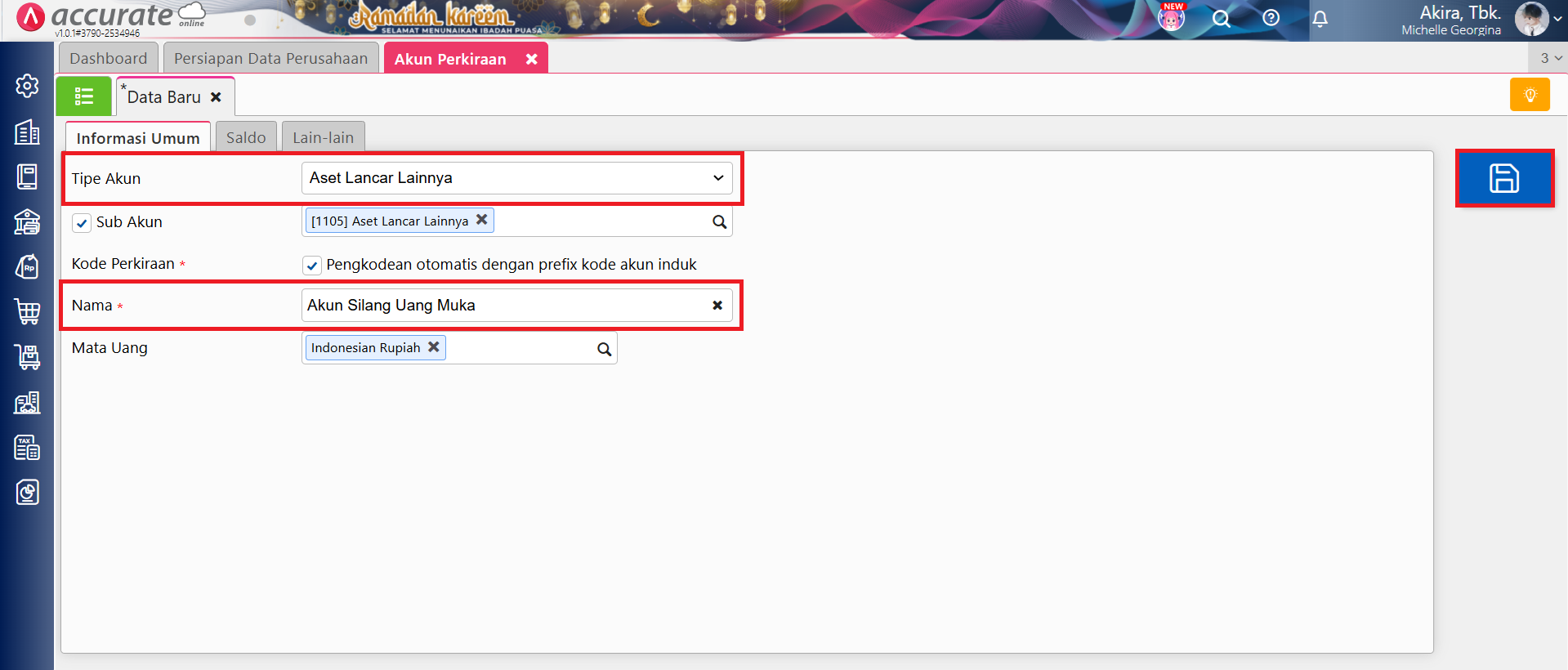 - Buat akun perkiraan dengan tipe akun Aset Lancar Lainnya melalui menu Buku Besar | Akun Perkiraan, dan berikan nama akun tersebut (misal, Akun Silang Uang Muka).