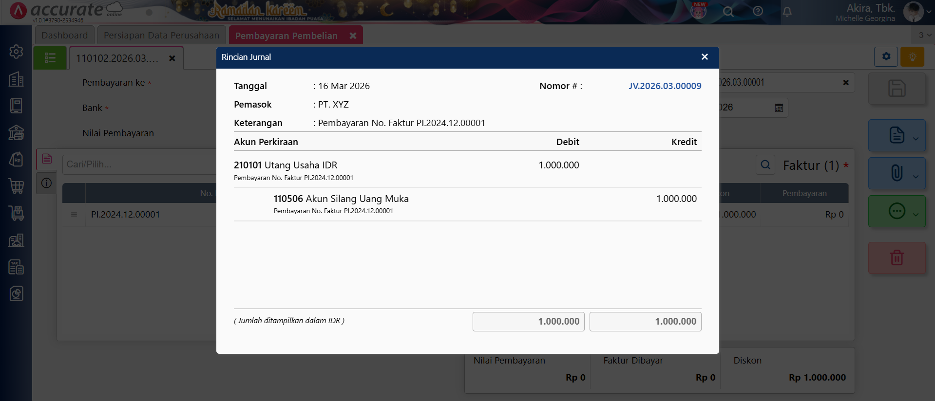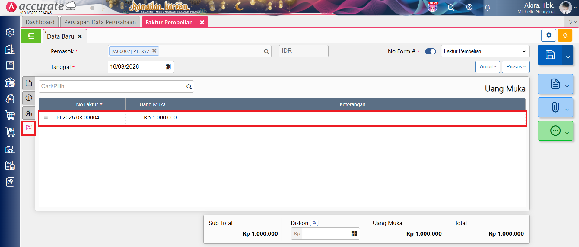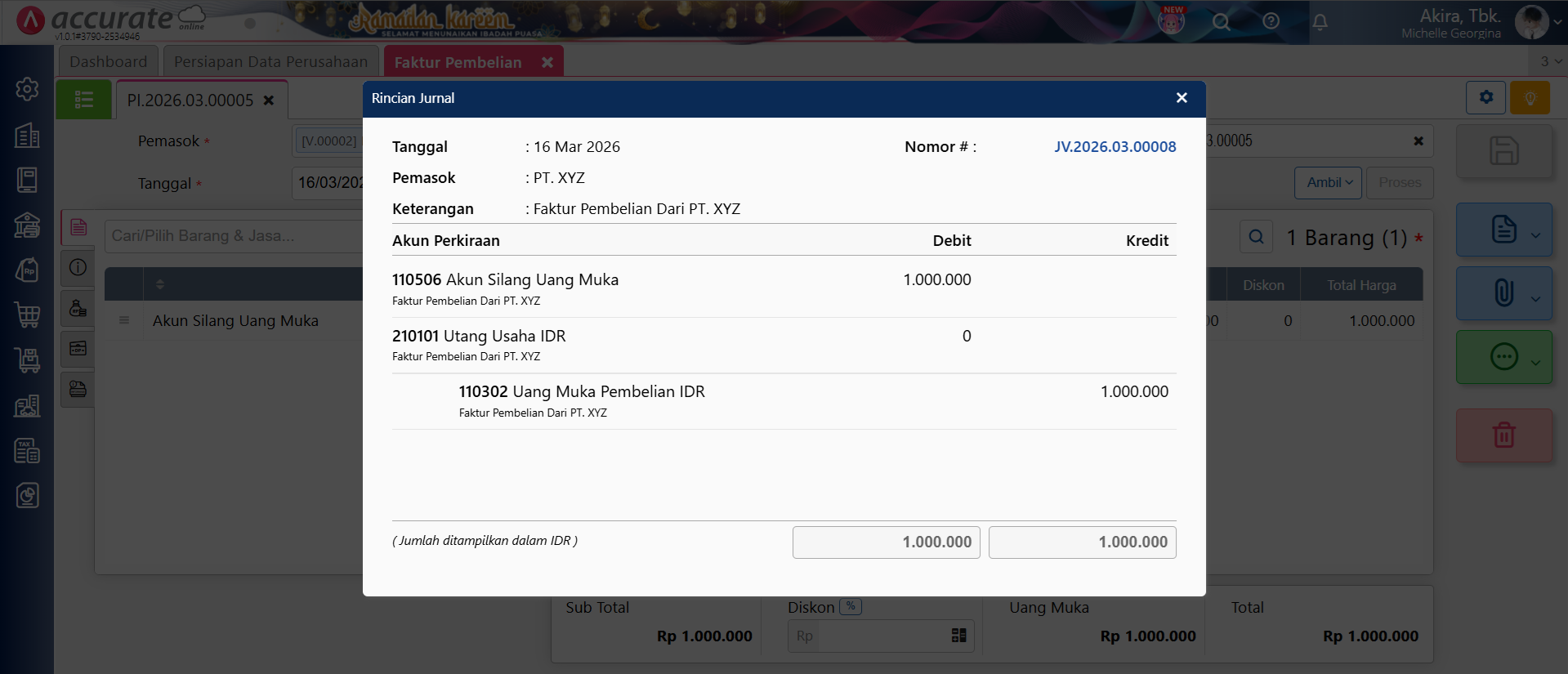 Perusahaan memiliki utang kepada PT. XYZ sebesar Rp 1.000.000 dan akan dilunasi dengan menggunakan sisa uang muka pembelian. Utang PT. XYZ sebesar Rp 1.000.000 pada database Accurate Online tercatat sebagai transaksi saldo awal utang.