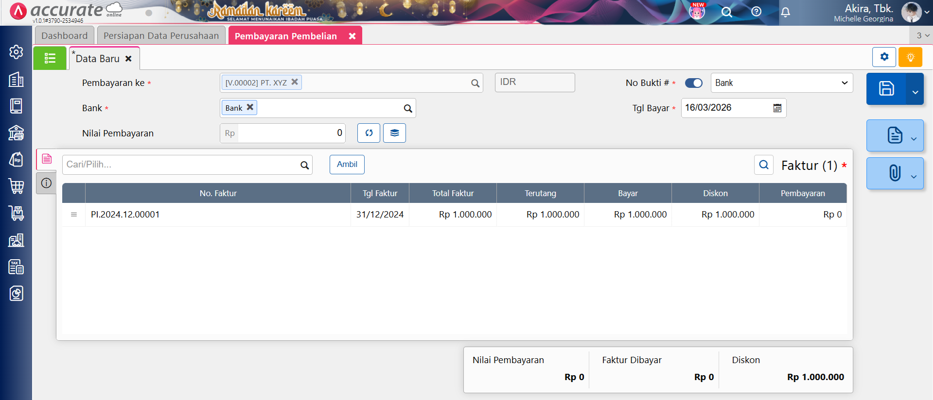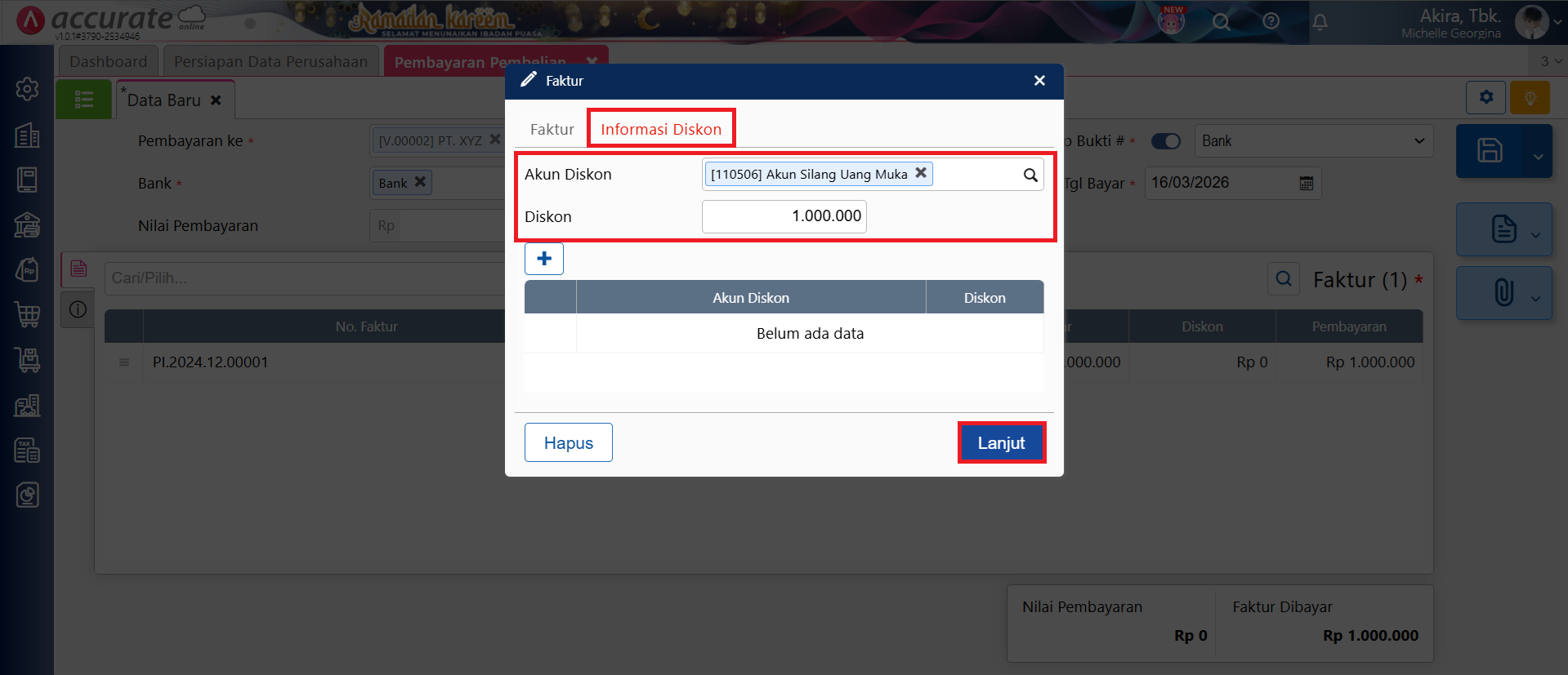 - Selanjutnya, buat transaksi Pembayaran Pembelian melalui menu Pembelian | Pembayaran Pembelian. Lalu pilih pemasok PT. XYZ, kemudian pilih nomor Faktur Pembelian saldo awal. Ke tab Informasi Diskon, isikan nilai diskon dengan nilai utang yang dilunasi, yaitu Rp 1.000.000 dan pilih akun diskon dengan akun perantara pada poin 1, yaitu Akun Silang Uang Muka.