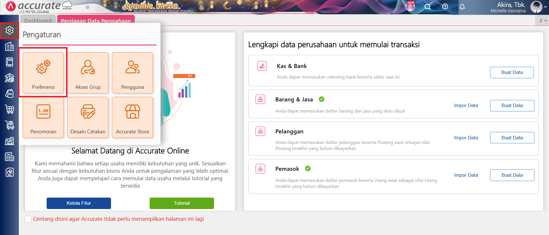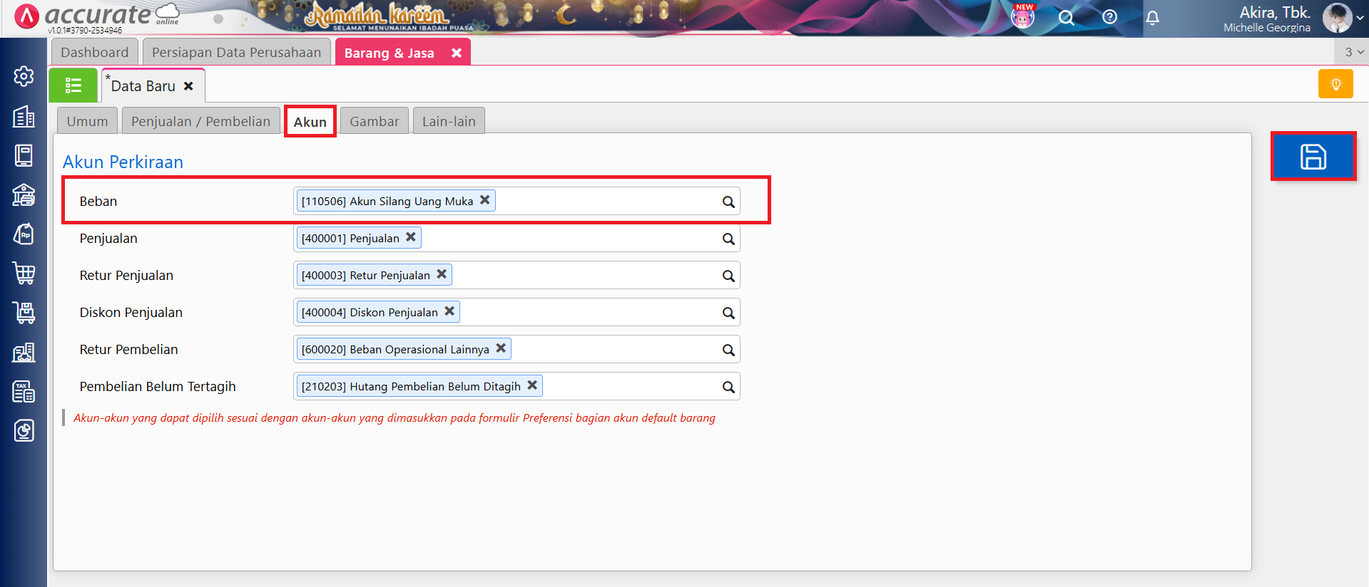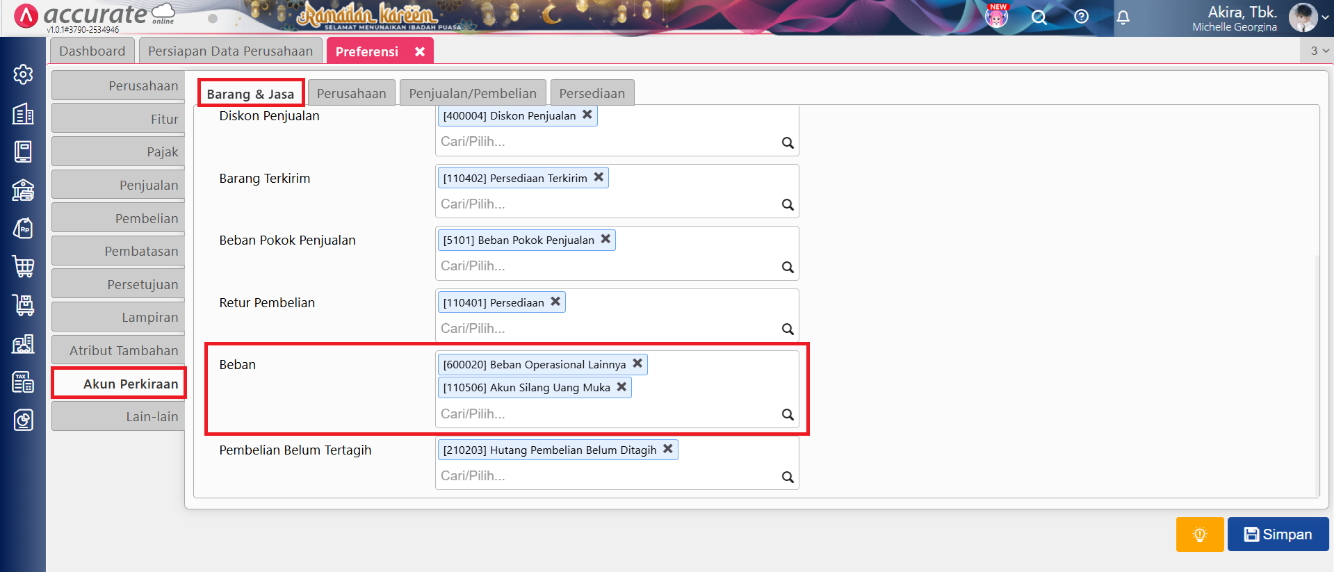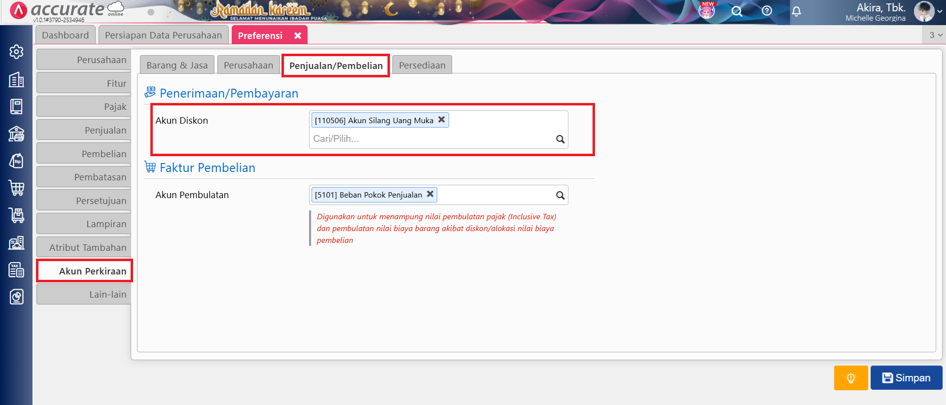 - Selanjutnya, daftarkan akun perantara tersebut pada menu Pengaturan | Preferensi | Akun Perkiraan pada bagian Barang & Jasa (Beban) dan pada bagian Penjualan/Pembelian (Akun Diskon), lalu klik Simpan.