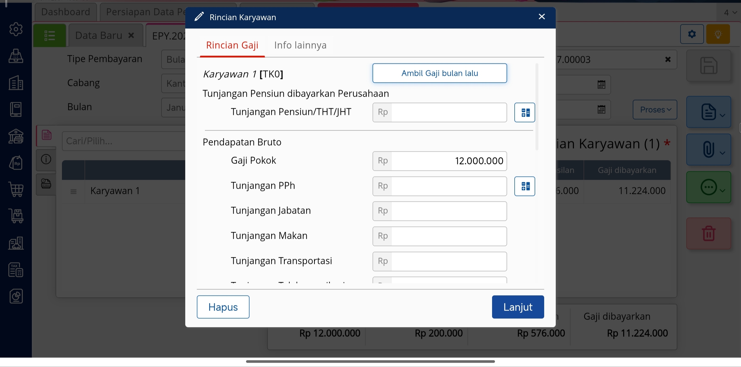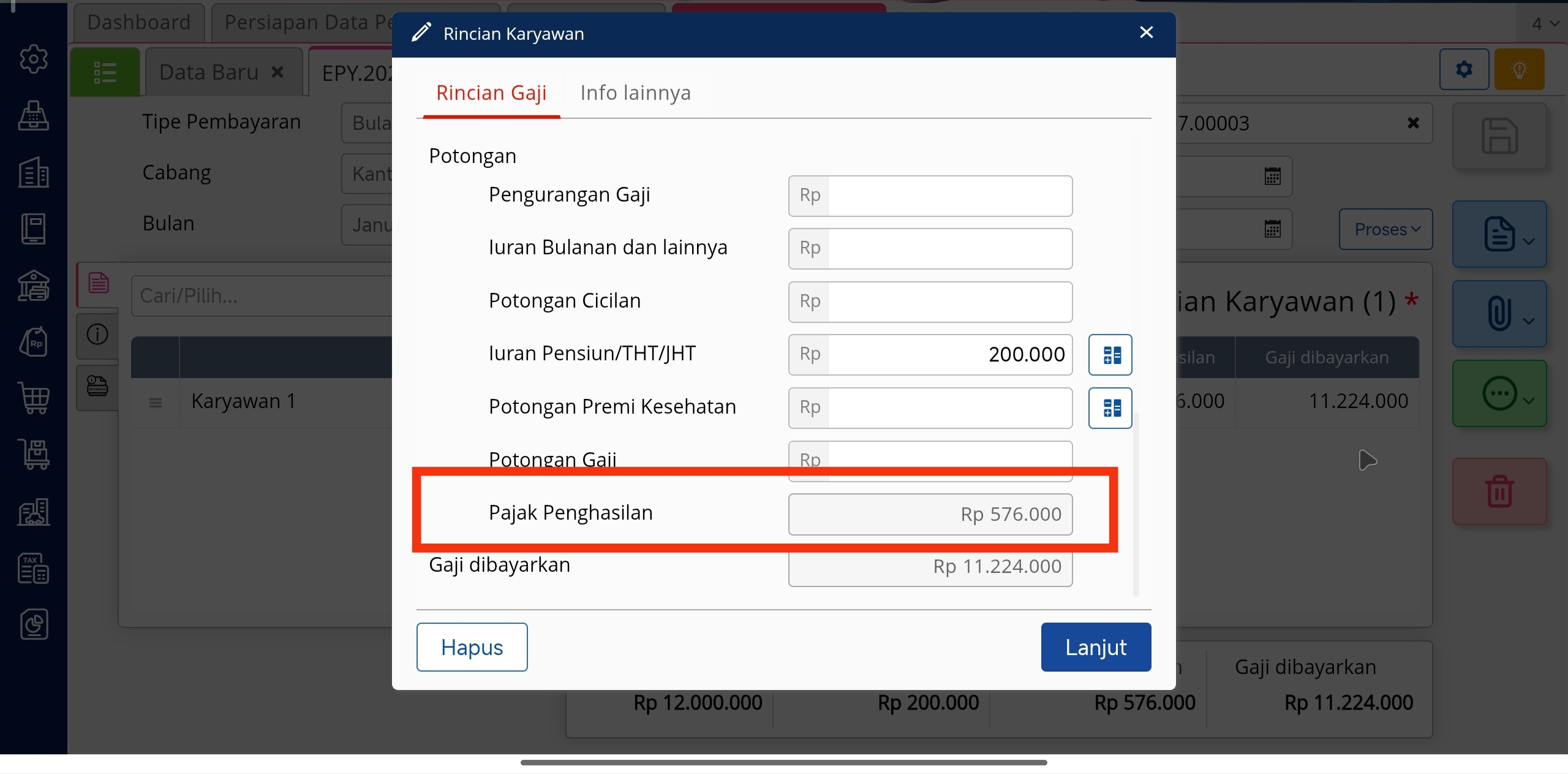 Ilustrasi: Karyawan A merupakan karyawan tetap dengan status PTKP TK/0 (Tidak Kawin dan Tidak Ada Tanggungan). Karyawan tersebut mendapat Gaji Pokok 12.000.000/bulan. Selain itu, ia juga dikenakan Iuran Pensiun sebesar Rp 200.000. Pada saat melakukan pencatatan Gaji atas karyawan tersebut, nilai PPh 21 yang terhitung oleh sistem sebesar Rp 576.000. Nilai tersebut tercatat lebih tinggi dari tarif seharusnya.