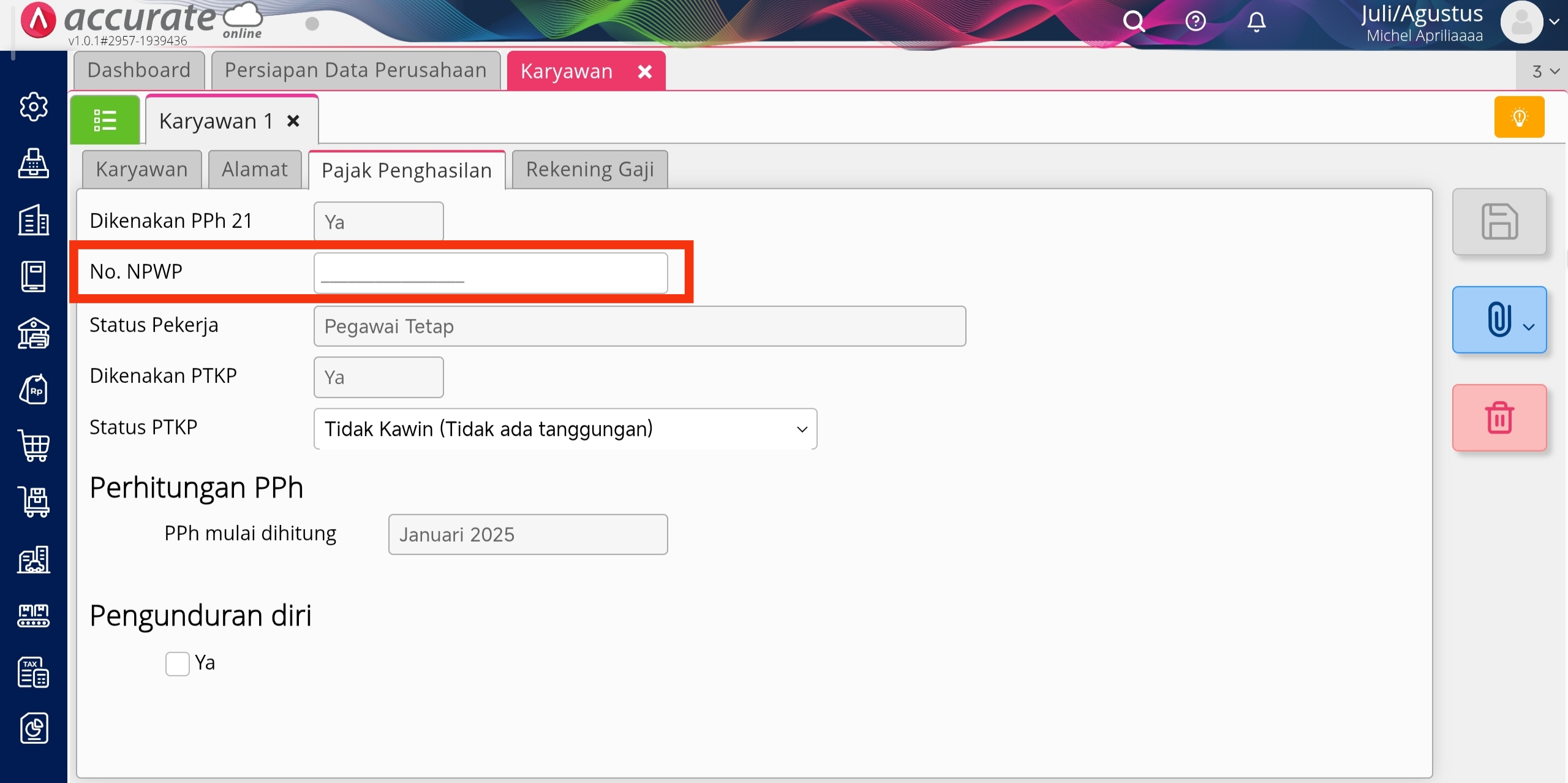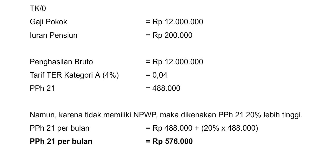 Perhitungan PPh 21 karyawan tanpa NPWP atas ilustrasi tersebut di Accurate Online: