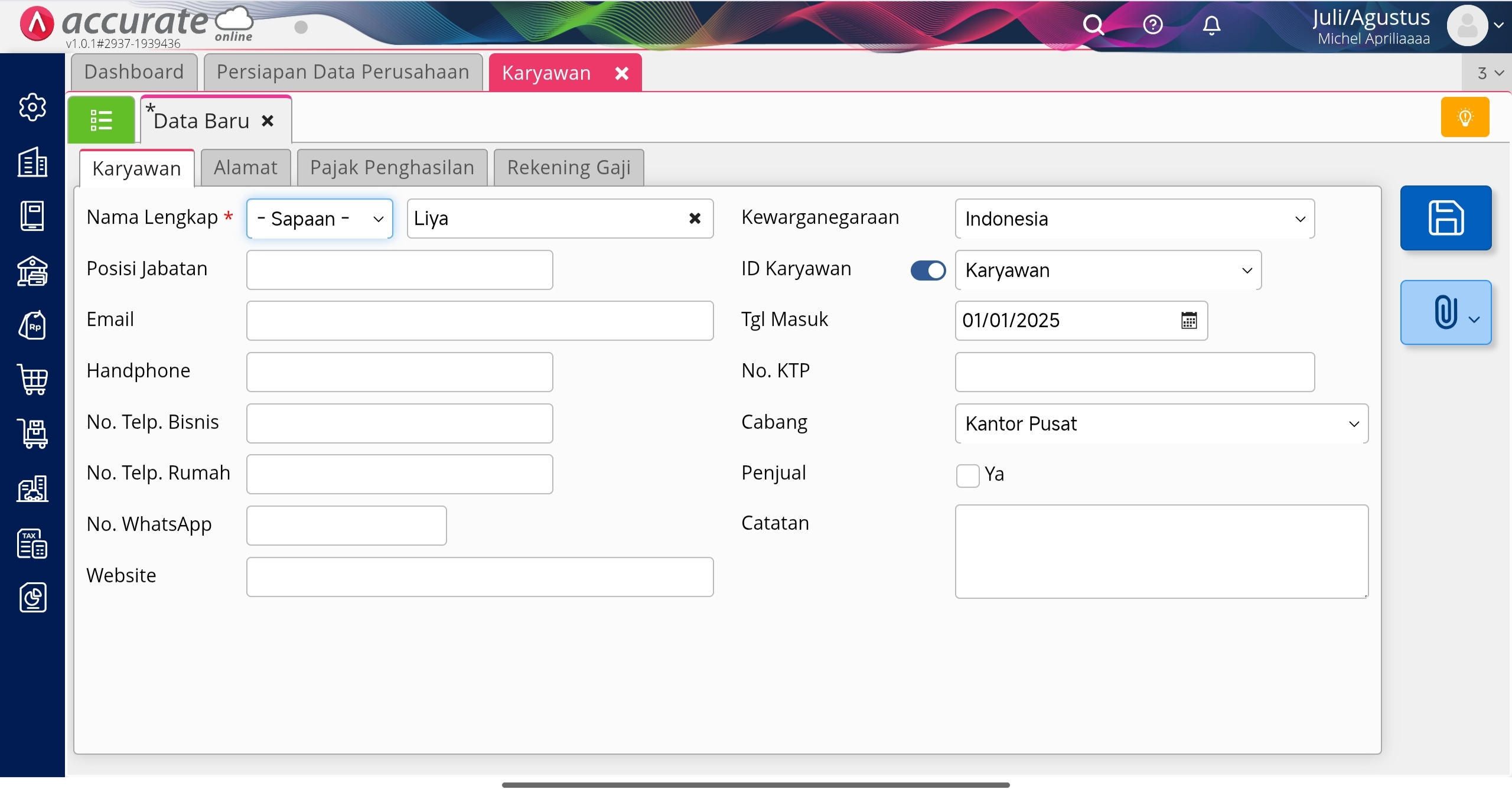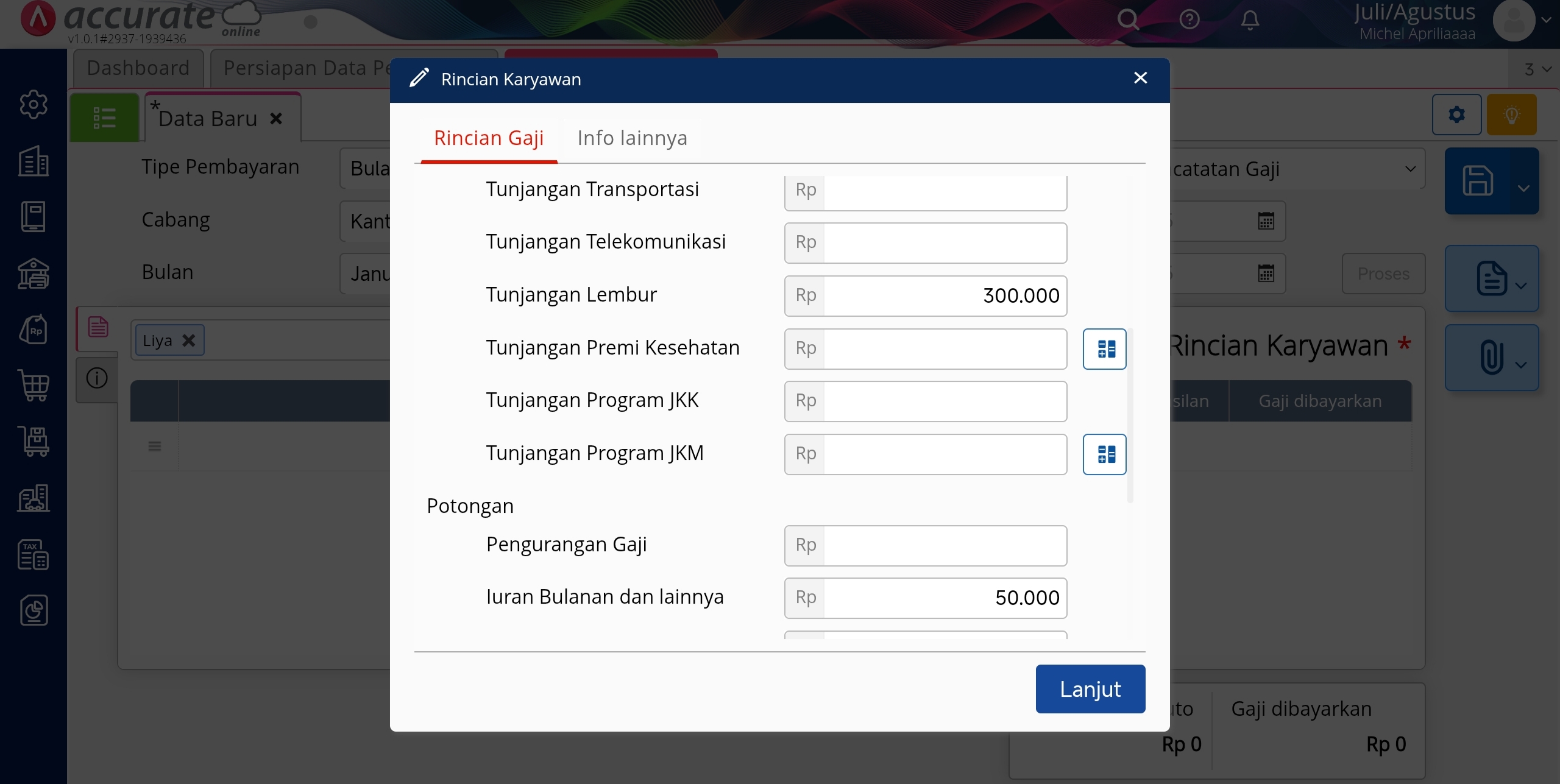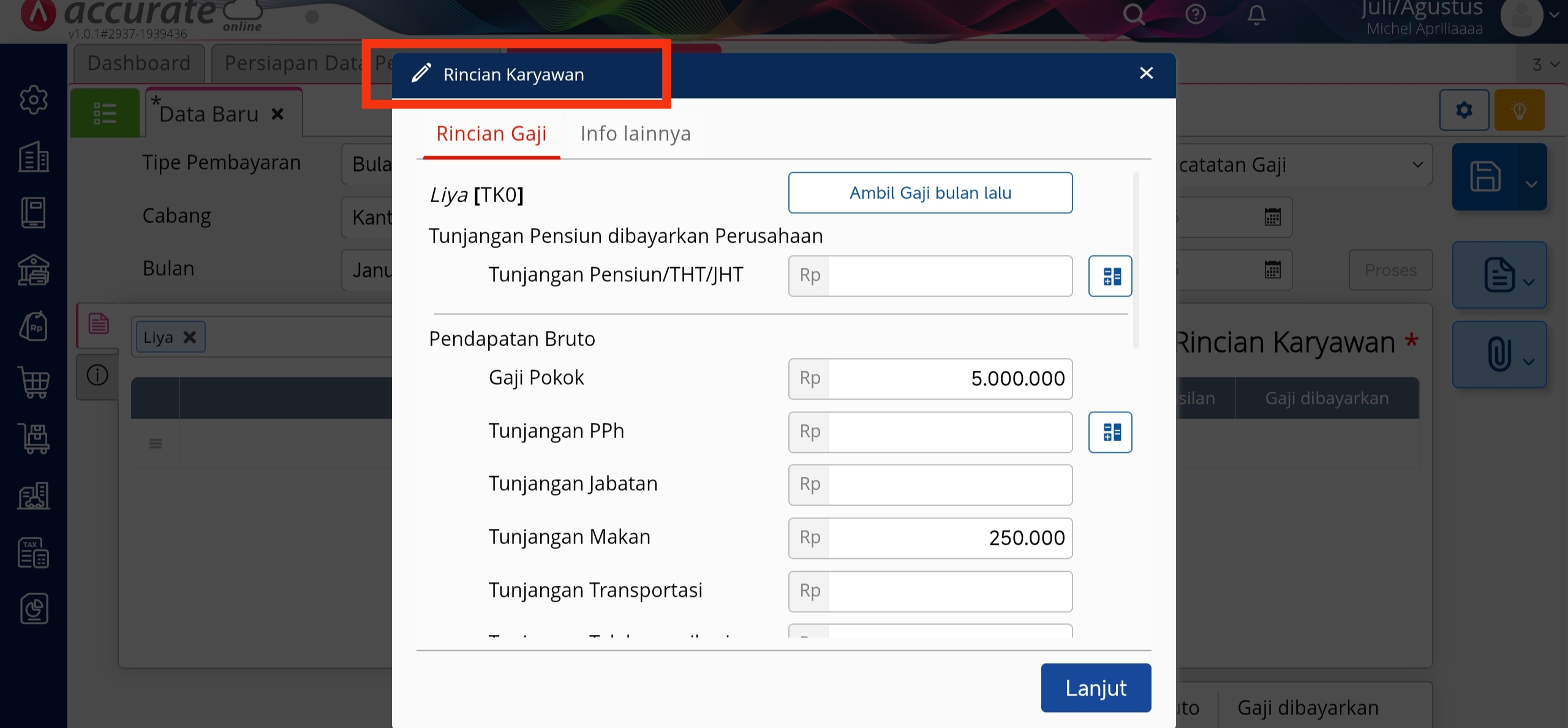 - Pada Rincian Karyawan, isikan Rincian Gaji dari karyawan tersebut.
