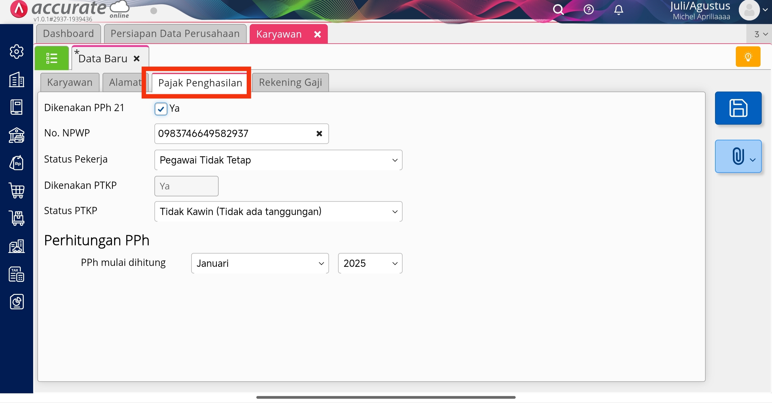 - Buat Data Baru dan isikan informasi yang dibutuhkan. Pada tab Pajak Penghasilan, isikan informasi terkait pajak karyawan tersebut mulai dari kolom No. NPWP, Status Pekerja pilih Pegawai Tidak Tetap, dan Status PTKP pilih Tidak Kawin (Tidak ada tanggungan). Pada informasi Perhitungan PPh, isikan bulan dimana PPh karyawan tersebut mulai dihitung misalnya bulan Januari tahun berjalan. Kemudian klik Simpan.
