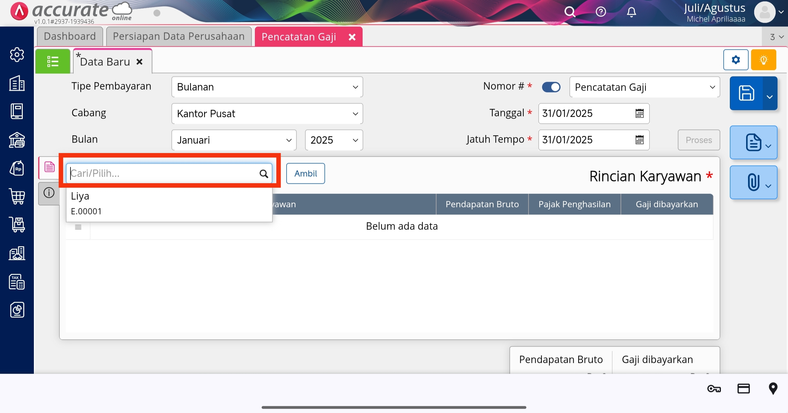 - Selanjutnya, buat pencatatan gaji karyawan tersebut di menu Buku Besar | Pencatatan Gaji. Isikan informasi yang dibutuhkan, lalu di kolom Cari/Pilih, pilih karyawan yang telah dibuat sebelumnya, maka akan tampil Rincian Karyawan.