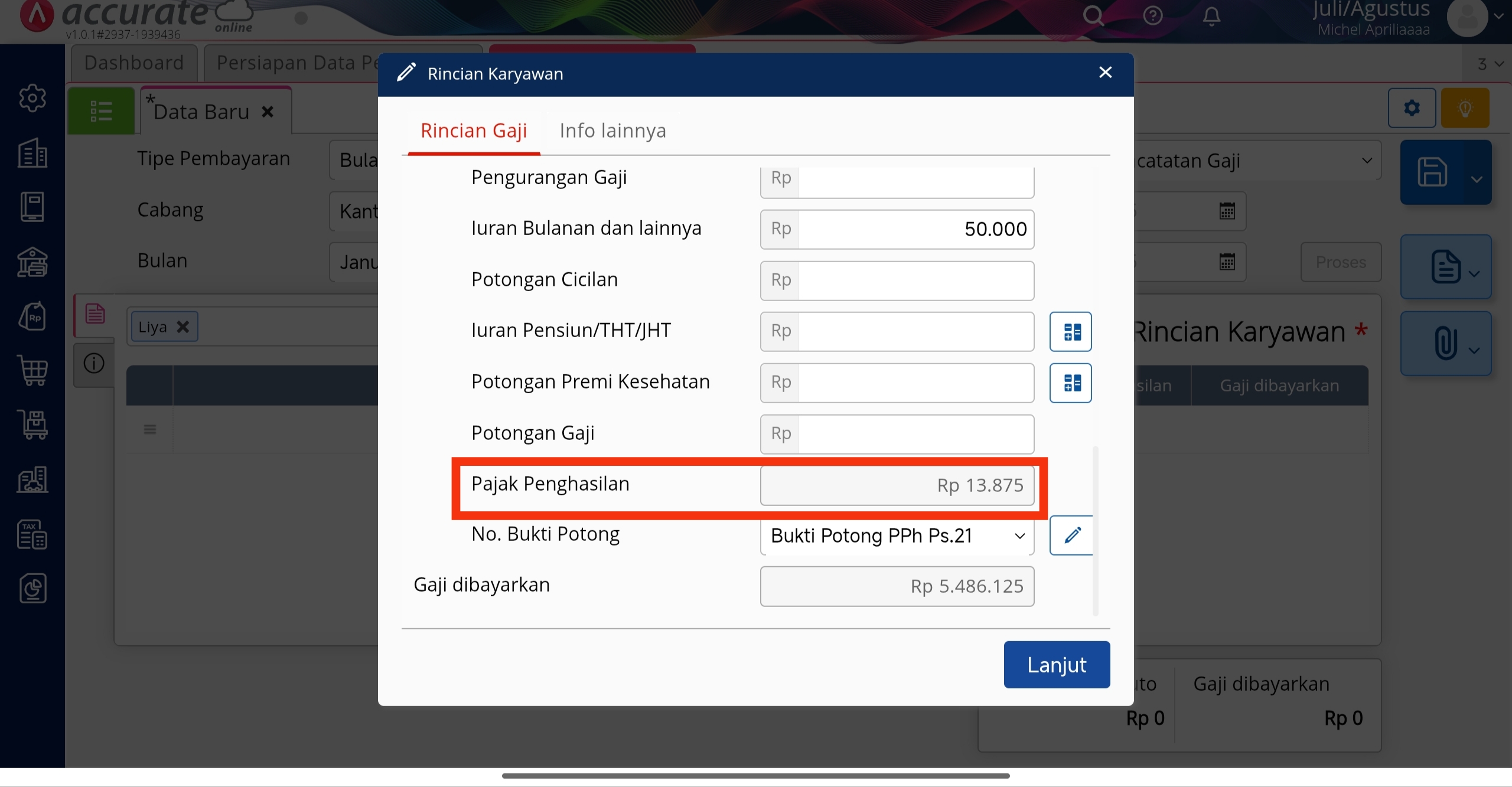 - Jika sudah terinput semua informasi terkait gaji karyawan tersebut, maka PPh 21 akan otomatis dihitung oleh Accurate mengikuti peraturan terbaru. Pada ilustrasi ini, Pajak Penghasilan (PPh 21) nya senilai Rp 13.875.