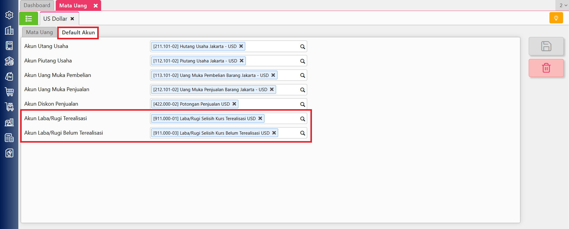 Nilai selisih kurs akan ditampung pada akun Laba/Rugi Terealisasi untuk tipe akun Kas/Bank dan pada akun Laba/Rugi Belum Terealisasi untuk tipe akun Piutang dan Hutang. Perhitungan nilai selisih kurs ini hanya berlaku pada akun-akun ber-mata uang asing saja, dengan tujuan untuk melakukan penilaian kembali atas nilai mata uang yang berlaku saat ini.