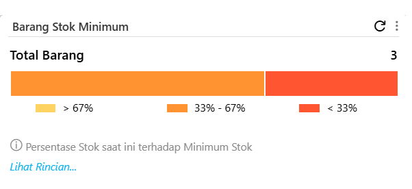 Ilustrasi: Jika dilihat pada widget Barang Stok Minimum, terdapat informasi Total Barang ada 3, dengan rincian ada yang masuk ke kategori persentase < 33 % dan 33 % – 67 %.
