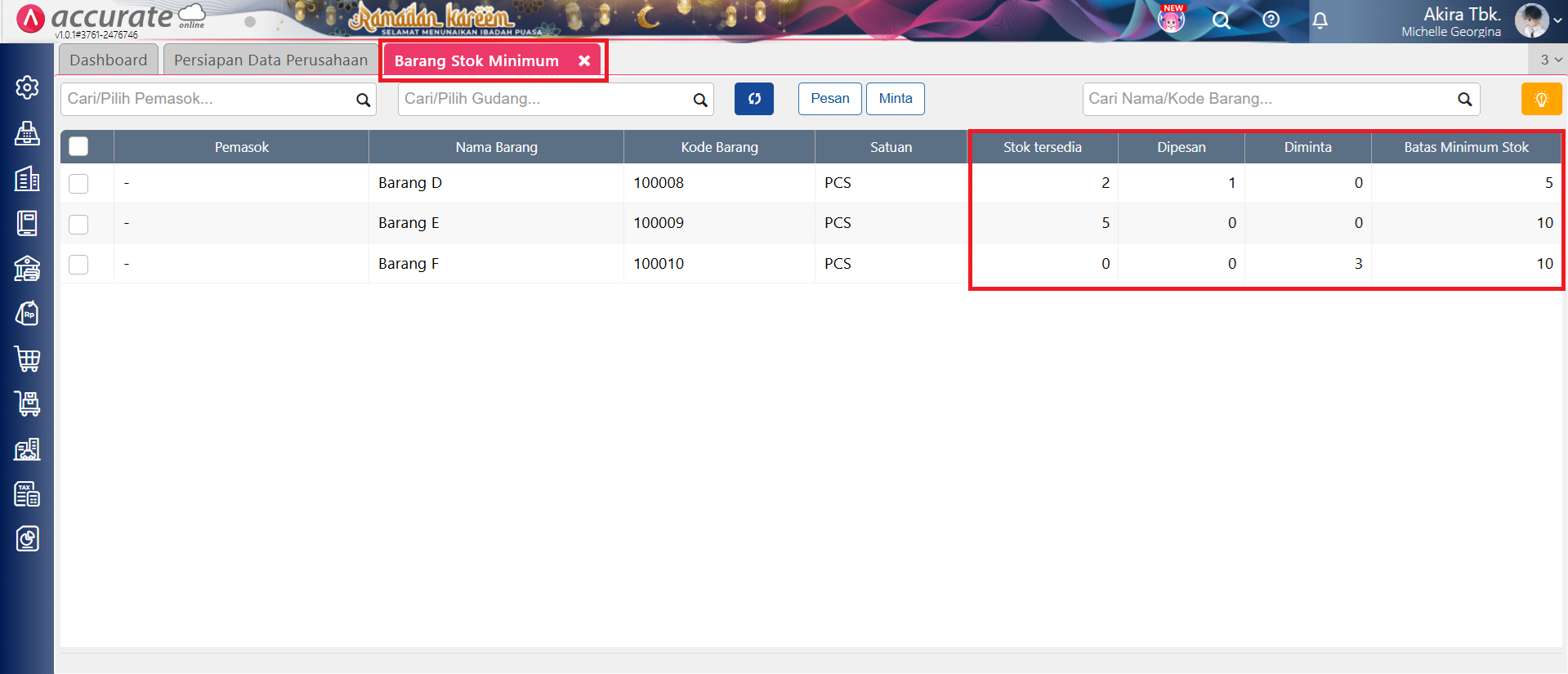 Berikut perhitungan atas widget Barang Stok Minimum  di Accurate Online: