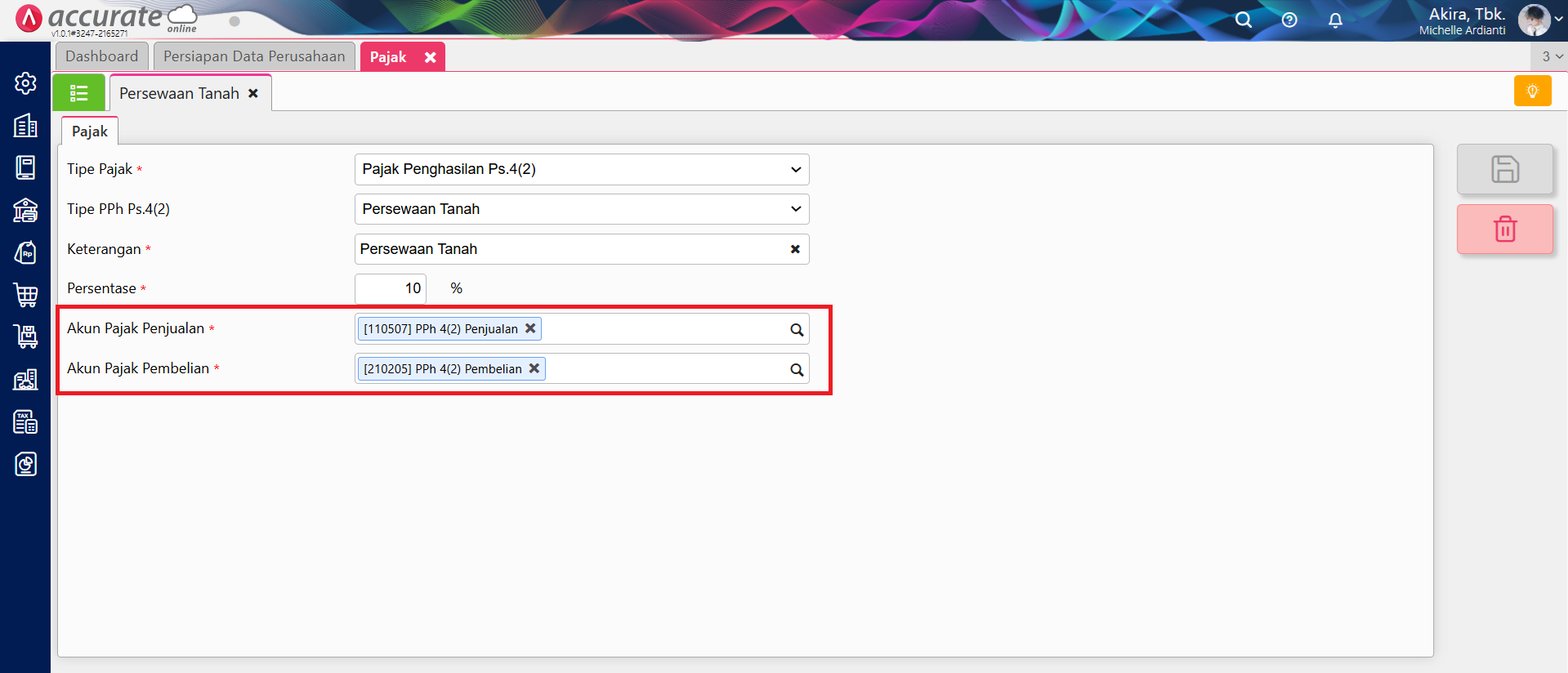 - Membuat Pajak PPh Pasal 4 (2) dari menu Perusahaan | Pajak. Jika ingin membuat PPh pasal 4(2) atas persewaan tanah, maka pilih Tipe PPh Ps. 4(2) adalah Persewaan Tanah, maka tampil secara otomatis Persentase atas pajak tersebut (bisa diubah). Lalu pilih akun penampung untuk pajak penjualan/pembeliannya, dan klik Simpan.