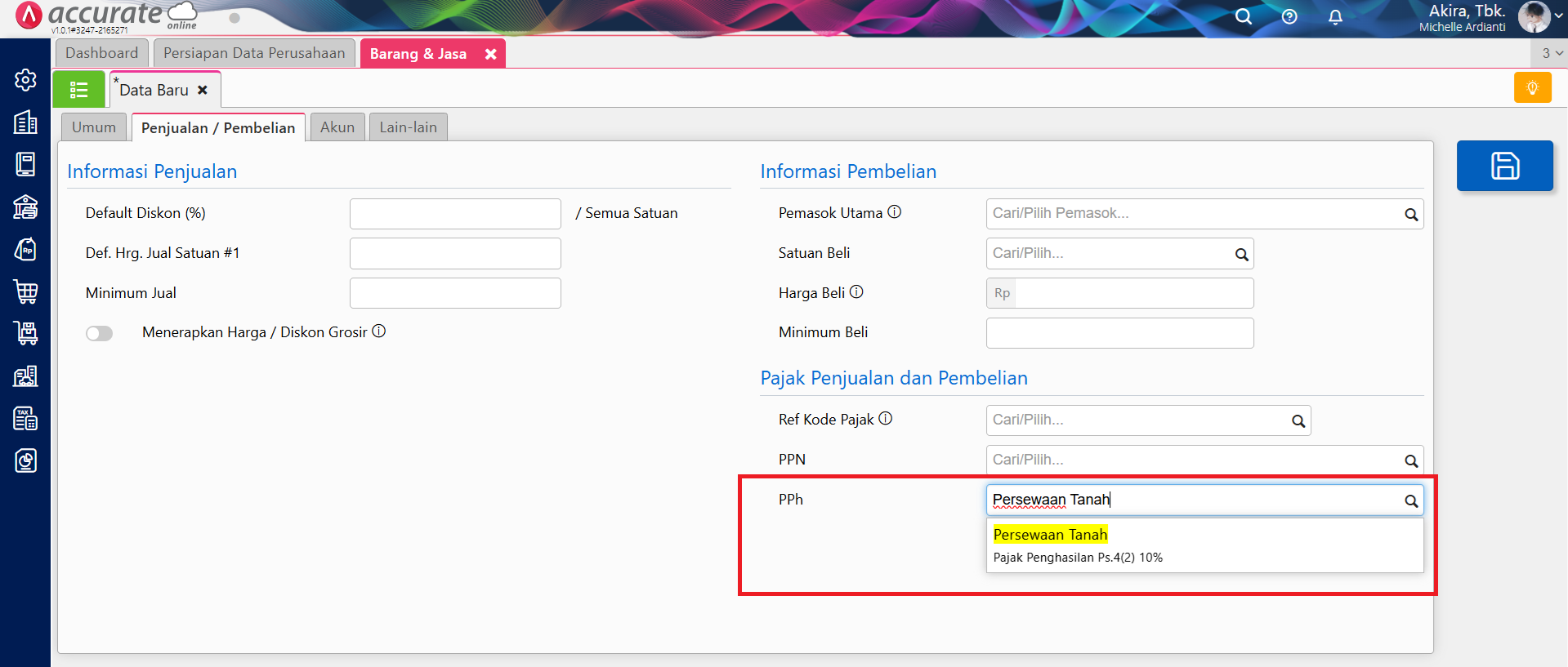 - Buat Barang dengan jenis barang Jasa, kemudian pada tab Penjualan/Pembelian di bagian Pajak, untuk PPh pilih tipe Pajak PPh Pasal 4 Ayat 2, setelah itu Simpan.